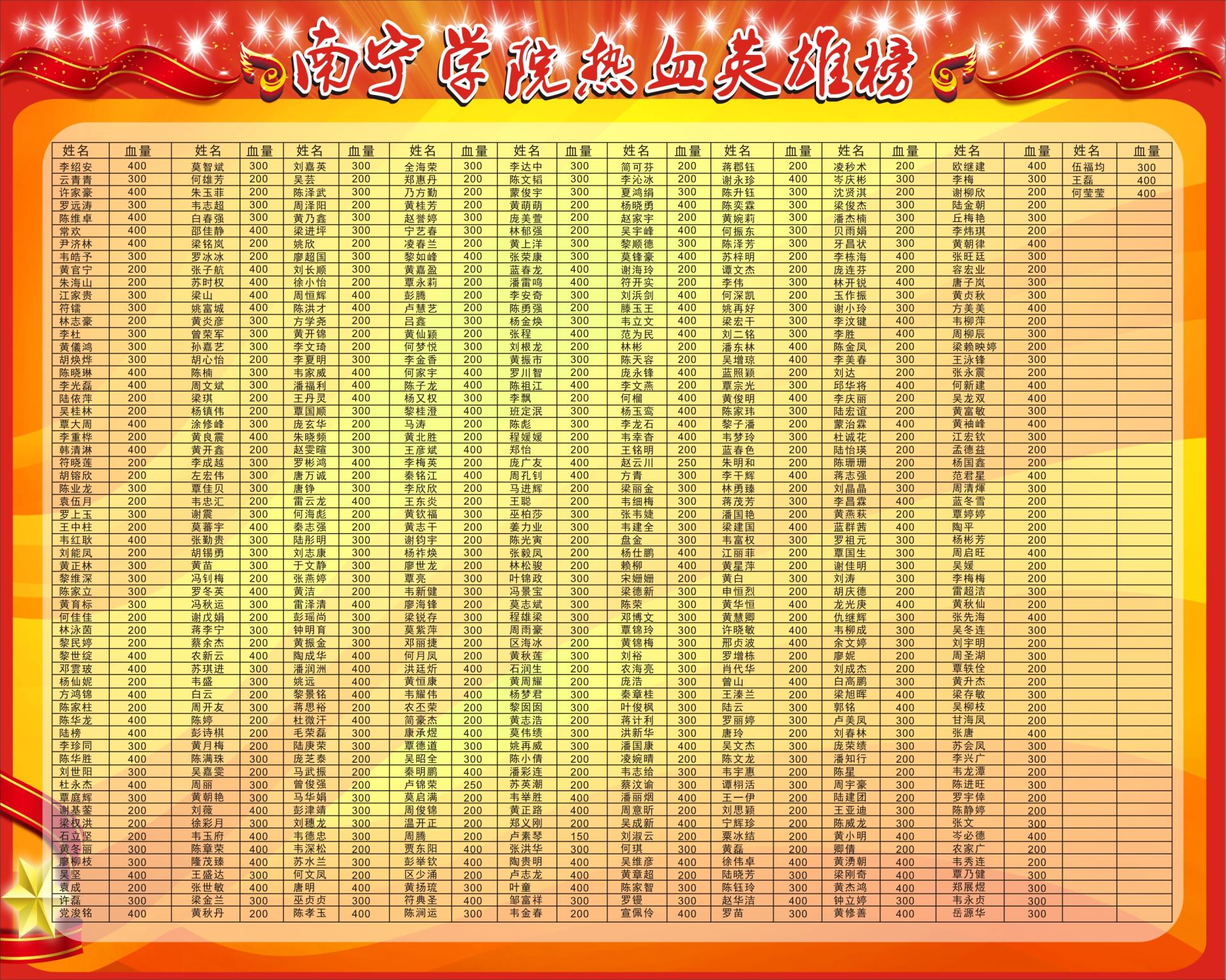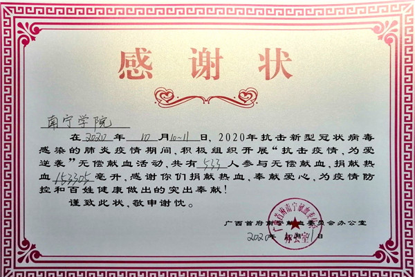 本次无偿献血活动系2020年抗击新型冠状病毒感染的肺炎疫情期间学校举办的首场献血活动,为做好献血活动的疫情防控工作,学校采用线上预约的方式,有效控制好各时段的献血人流,切实保障活动的安全有序进行。广大师生在此期间积极响应号召,纷纷化身献血志愿者,用实际行动证明自己作为青年一代的责任与担当。在为期两天的献血活动中,全校共有533人参与无偿献血共计献血153305毫升充分展现出南院学子“崇德、友爱、责任、奉献” 的不孤志愿服务精神,也是学校落实立德树人工作的良好体现。(文/刘容杏  青年传媒中心黄盈盈  图/青年传媒中心  审核发布/黄鼎芹