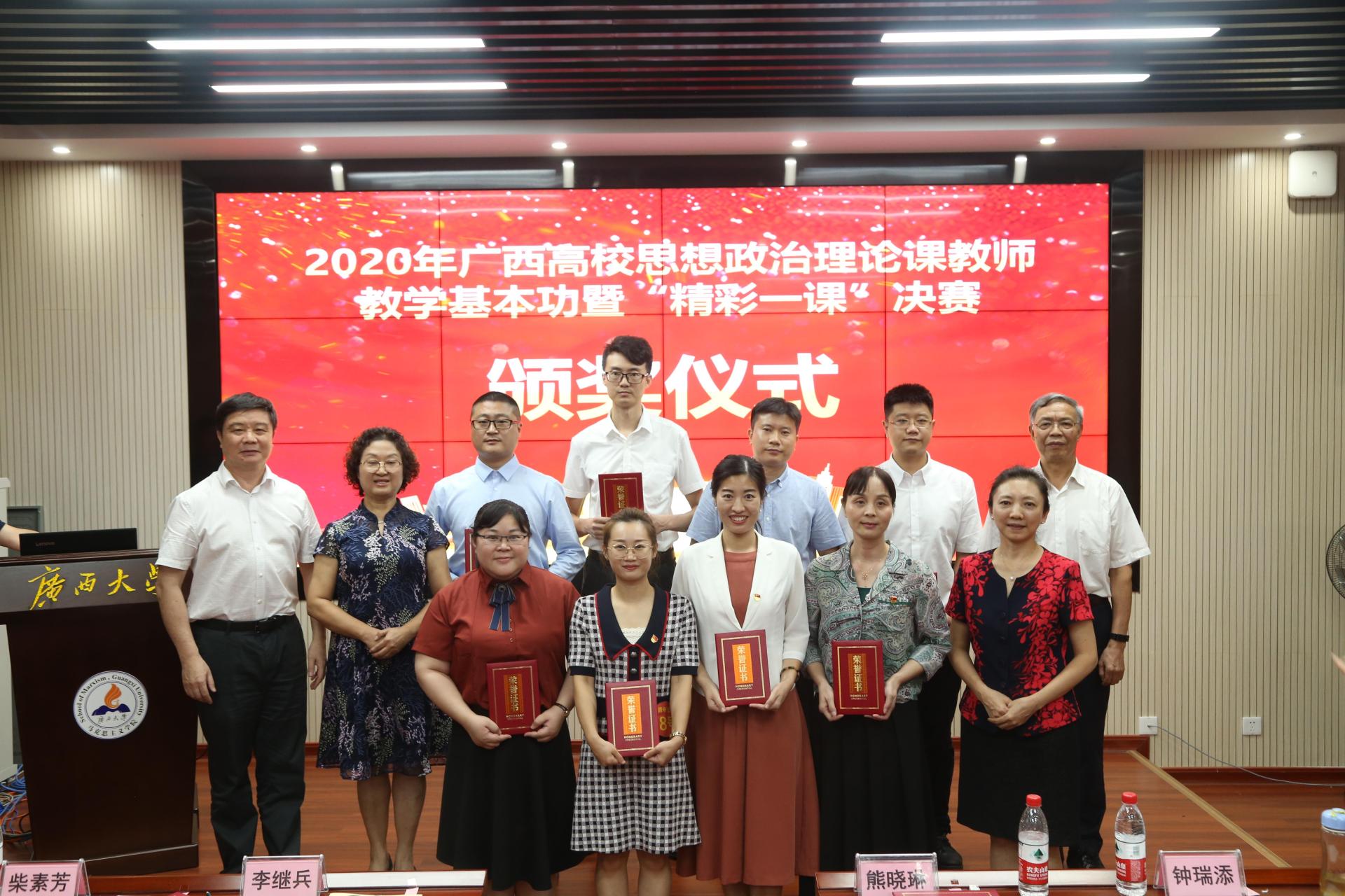 在自治区教育厅刚刚公布的2020年广西高校思想政治理论课教师教学基本功暨“精彩一课”比赛获奖名单中,学校马克思主义学院教师荣获一等奖1名,二等奖1名,三等奖4名,实现了学校参赛思政课教师全部获奖的喜人成绩!