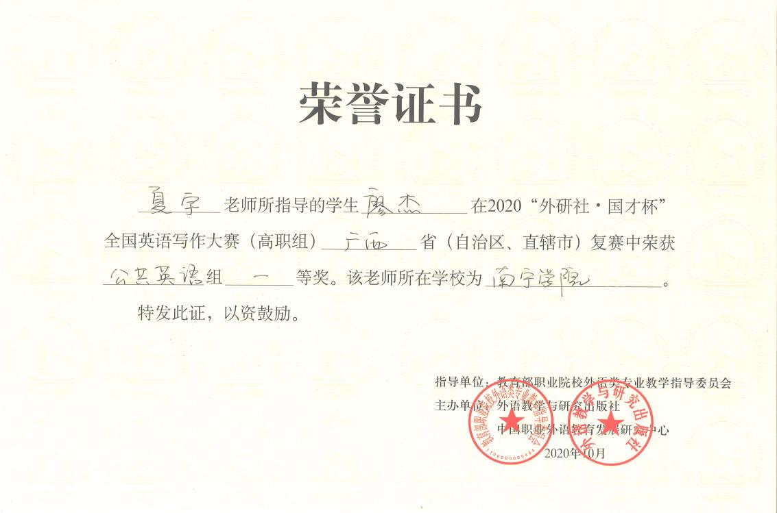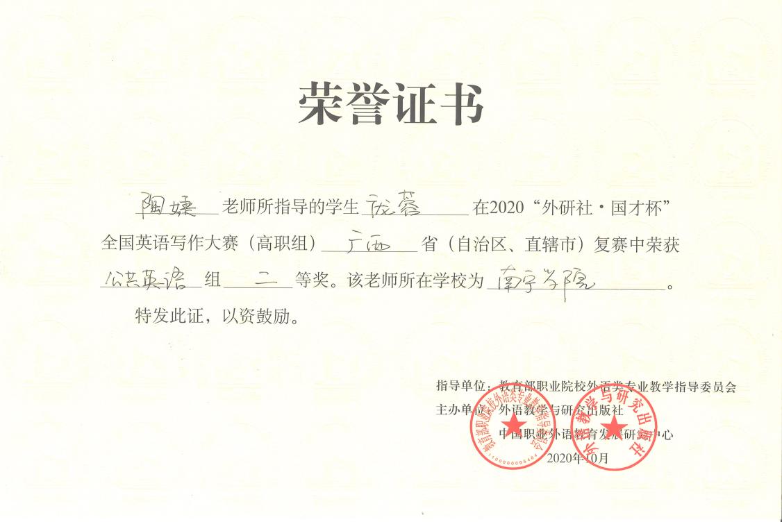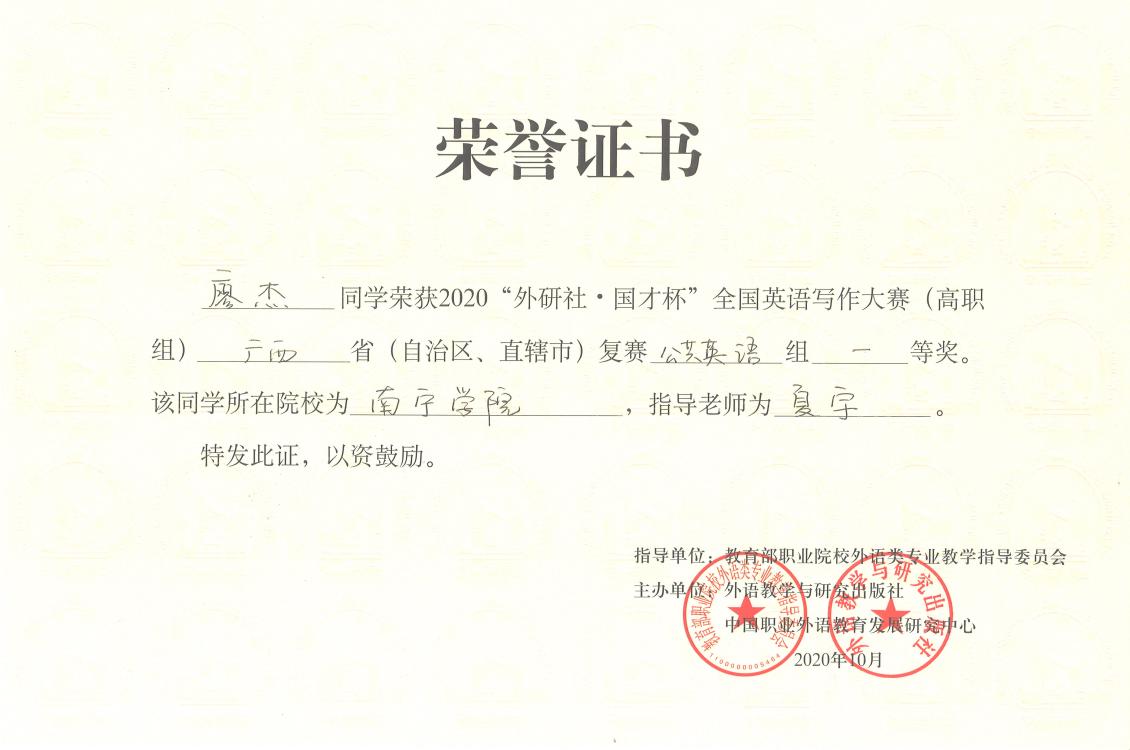 【喜讯】Beat365中文官方网站学生荣获2020“外研社·国才杯”全国英语写作大赛(高职组)复赛广西赛区一等奖