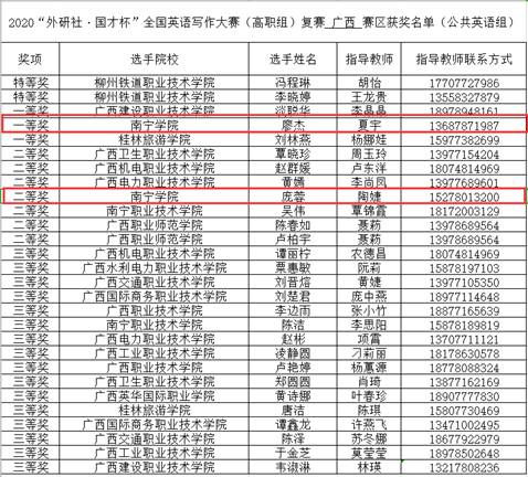 日前,2020“外研社·国才杯”全国英语写作大赛(高职组)复赛广西赛区结果揭晓,Beat365中文官方网站两名参赛选手在本次比赛中表现优秀,获得佳绩。交通学院2019级物流管理专业的廖杰同学荣获一等奖,管理学院2019级工商企业管理专业的庞蓉同学荣获二等奖。