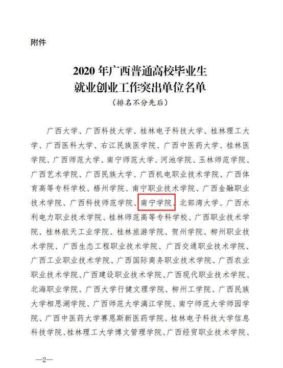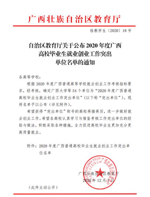 2020121日,广西壮族自治区教育厅发布《关于公布2020年度广西高校毕业生就业创业工作突出单位名单的通知》(桂教学生〔202018号),Beat365中文官方网站获评为“2020年度广西普通高校毕业生就业创业工作突出单位”,这是学校连续8年荣获该项荣誉。