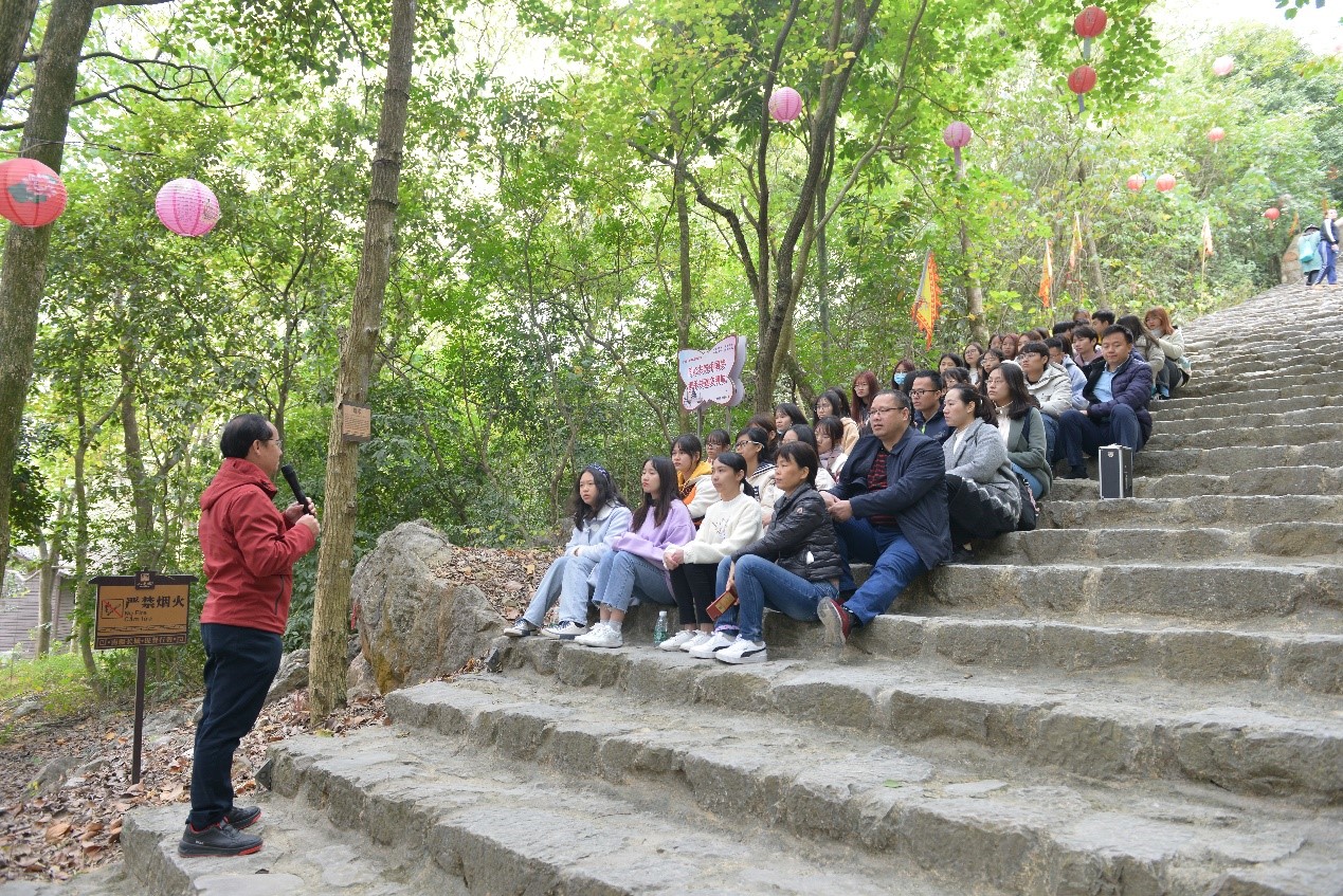 随后,师生一行前往龙州县小连城。大家一同坐在小连城山脚下,听陈副校长讲述小连城的历史事件。一行人途经保元宫、蛇神庙、天阙、卫龙炮台,最后到达山顶的镇龙炮台,陈副校长带领同学们一路上在实践中学习,在学习中实践。