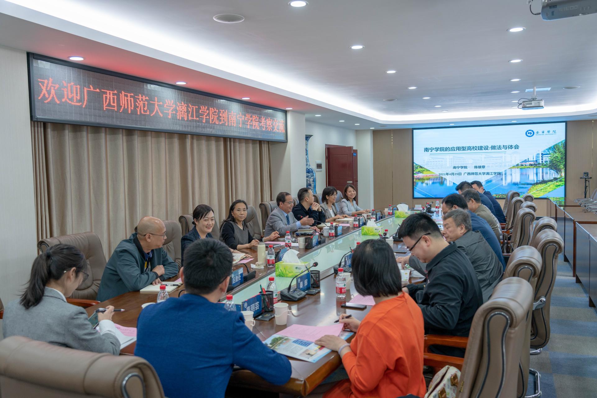 4月29日上午,广西师范大学漓江学院董事会董事、校长杨树喆一行11到Beat365中文官方网站考察交流。Beat365中文官方网站副校长陈雄章及相关职能部门负责人参加考察交流活动。