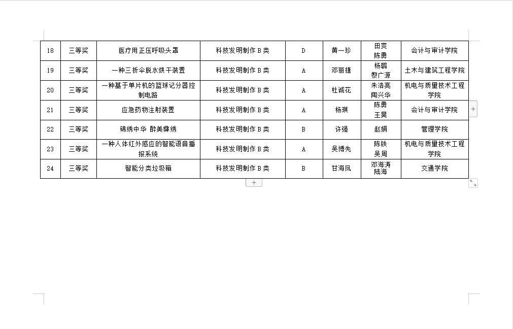 经过激烈地角逐,24件优秀作品脱颖而出,其中《浅谈客家建筑文化的保护与传承—以广西君子垌客家围屋群为例》等4件作品荣获一等奖,《新时代大学生“四史”教育的现状及对策研究》等7件作品荣获二等奖,《从“被动医疗”迈向“主动健康”——高校大学生对健康管理的现状及对策分析》等13件作品荣获三等奖。获奖作品涵盖竞赛中哲学社会科学类社会调查报告和学术论文、科技发明制作两大类别。