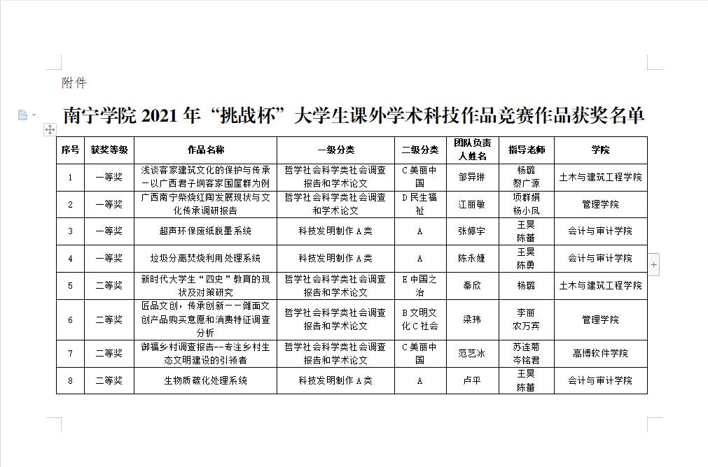 根据《关于组织开展第十届“挑战杯”广西大学生课外学术科技作品竞赛的通知》(桂青联发〔2021〕3 号)精神,我校共青团Beat365中文官方网站委员会联合创新创业学院于3月25日至4月23日共同举办了“挑战杯”Beat365中文官方网站大学生课外学术科技作品竞赛。
