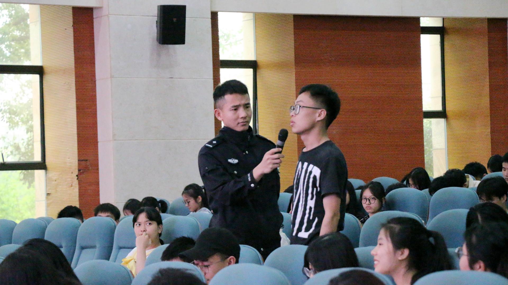 聂警官授课幽默风趣,接地气,与学生积极互动,精彩的讲授让在场的学生对电信网络诈骗有了更深入的了解和认识,对全体学生起到了很好的警示教育作用,为我校的防范电信网络诈骗工作打下坚实的基础。(学生工作处供稿  图/校通讯社  文/文有森)
