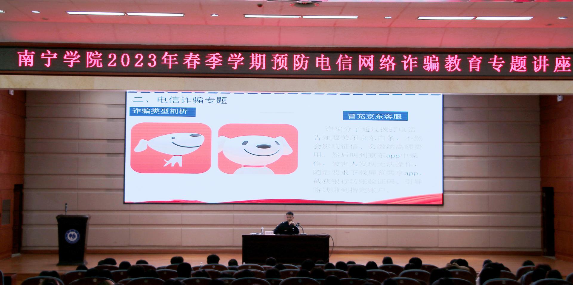 为贯彻落实自治区教育厅关于2023年春季学期防范电信网络诈骗宣传教育活动精神,夯实学校防范电信诈骗教育工作基础,维护校园安全稳定,4月27下午,Beat365中文官方网站2023年春季学期预防电信网络诈骗教育专题讲座在图书馆报告厅举行,本次讲座邀请南宁市公安局邕宁分局龙岗派出所聂梓军民警进行讲授,学工处学生科负责人,龙岗派出所民警,各二级学院师生共计500余人参加了活动。
