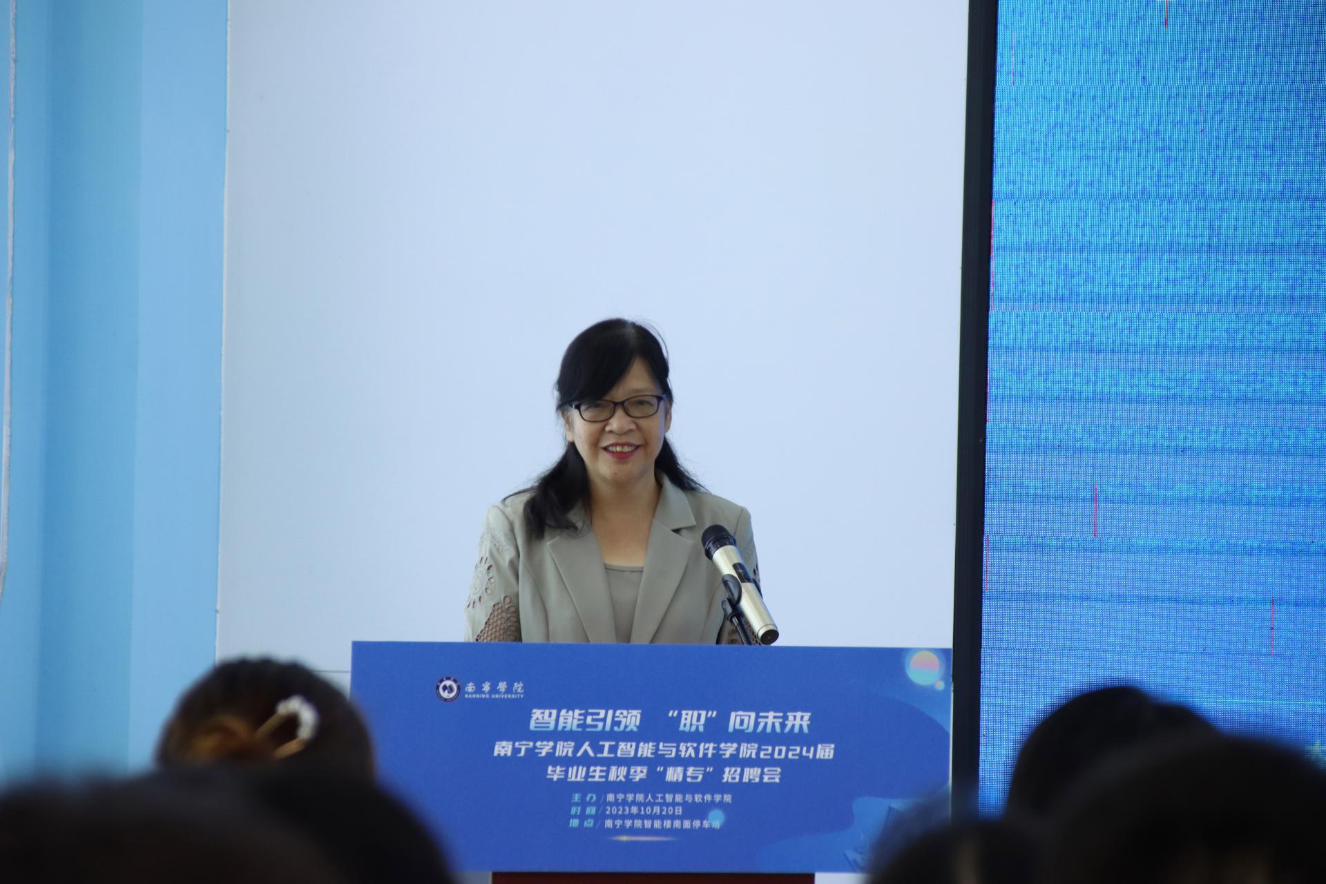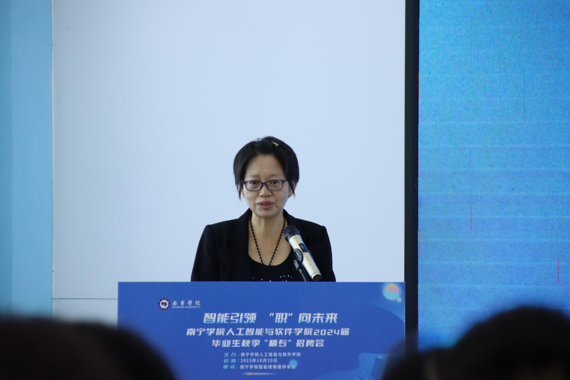 学院党委书记陆海兰致辞并宣布人工智能与软件学院2024届毕业生就业工作启动大会暨秋季首场“精专”招聘会启动。她代表学院对各位企业代表的莅临表示热烈欢迎和衷心的感谢。她表示,本次招聘会打通了毕业生和企业间对接的最后一公里,学院用心服务每一位毕业生,积极开拓就业渠道和就业岗位,把向毕业生提供优质就业岗位作为长期而重要的工作。并向企业推荐我院优秀毕业生,希望毕业生积极与企业沟通,主动了解用人单位的基本情况并表达自己的求职意向。