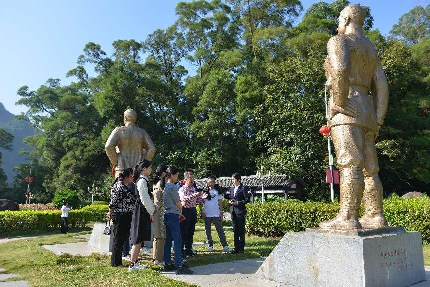 22日上午,团队师生瞻仰了东兰烈士陵园,在这片经历过战火洗礼的红土地上,长眠着大革命时期以来英勇牺牲的2258名东兰籍革命烈士和无名英烈,团队师生怀着无比崇敬的心情,在韦拔群烈士墓、革命烈士纪念塔前肃立默哀,行躯躬礼,悼念先烈英魂,追忆烈士功绩。最后,师生团队在拔群广场参观题词园和将军园,将军园中设有邓小平、韦拔群、张云逸、陈洪涛、黄大权、陆浩仁、黄昉日、黄举平、韦国清上将、韦杰中将、覃健中将、覃士冕、韦祖珍、覃国翰、姜茂生、黄松坚、覃应机、陆秀轩等18人的铜像以及展示他们的生平简历。陈雄章教授逐一向团队师生讲述了铜像背后的历史事迹,英雄的形象在心中鲜活而充满敬意。