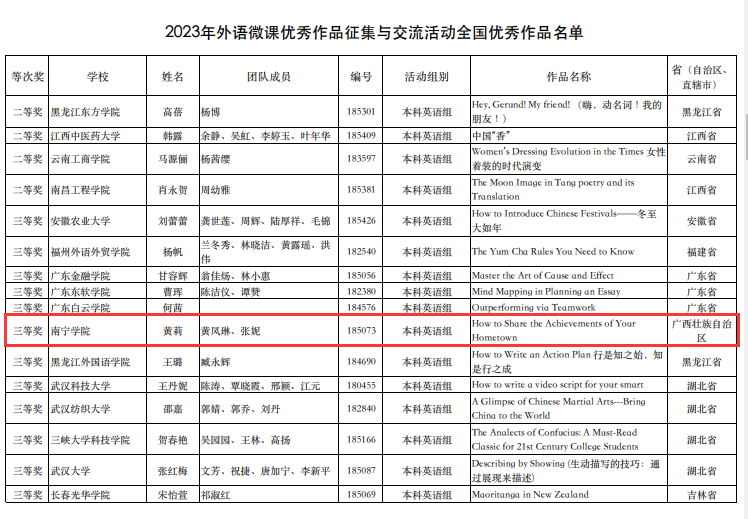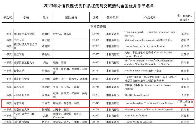 10月21日,2023年外语微课优秀作品征集与交流活动在北京落下帷幕,Beat365中文官方网站教育学院宁丽玫、谢立芳、黄思纯和杨乐老师组成的参赛团队经过层层选拔进入全国现场交流环节,通过微课作品展示、说课两个环节,凭借独特的教学设计和扎实的语言基本功在本次评选活动中脱颖而出,最终斩获本科英语组全国一等奖,此外,黄莉老师带领的团队荣获全国三等奖,林夏菲和张姝老师带领的两支团队获得本次活动广西区本科组二等奖。