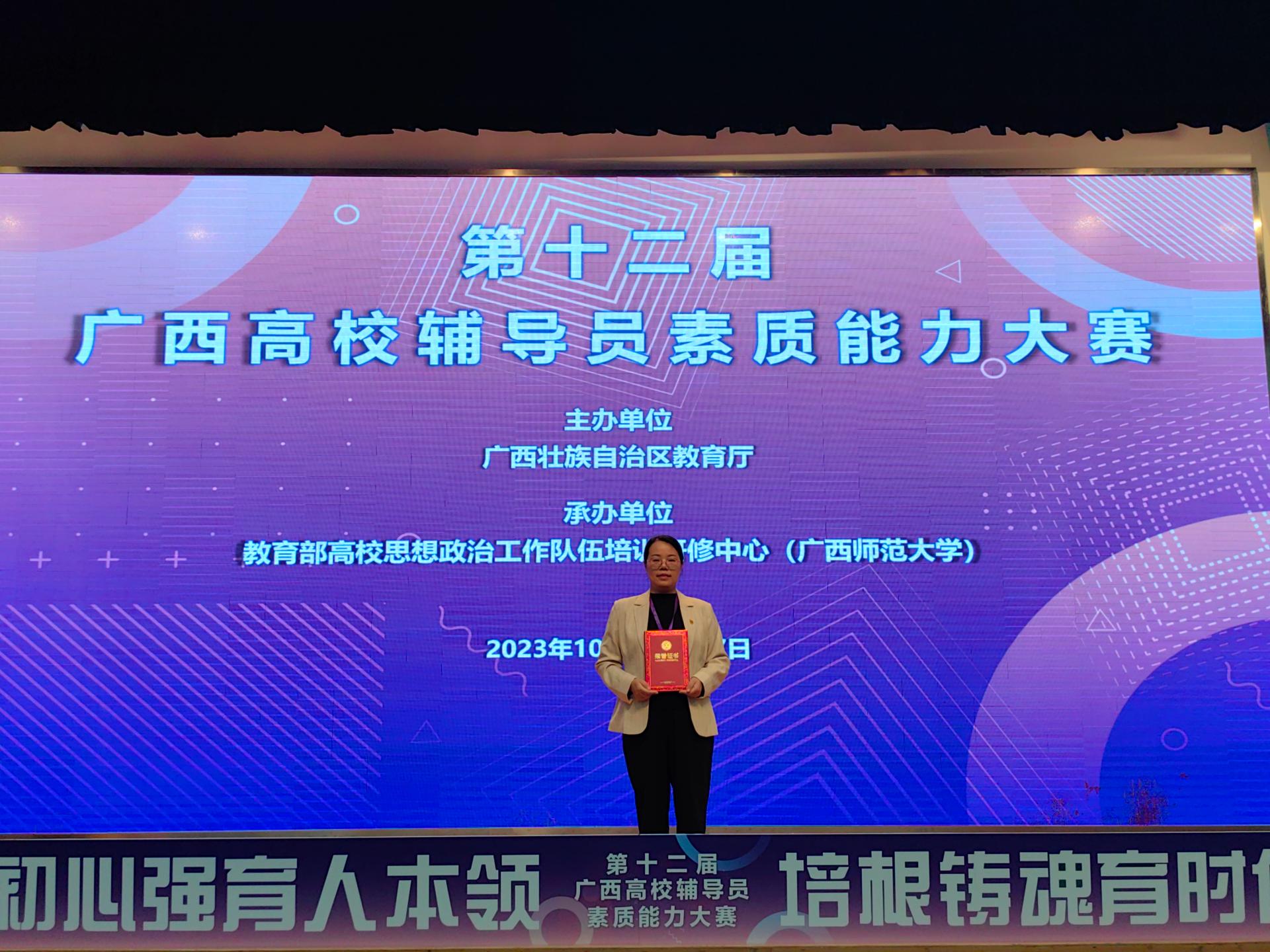 2023年10月25日至27日,由广西壮族自治区教育厅主办的第十二届广西高校辅导员素质能力大赛在广西师范大学举行,我校艺术与设计学院辅导员郭莉老师荣获大赛二等奖。
