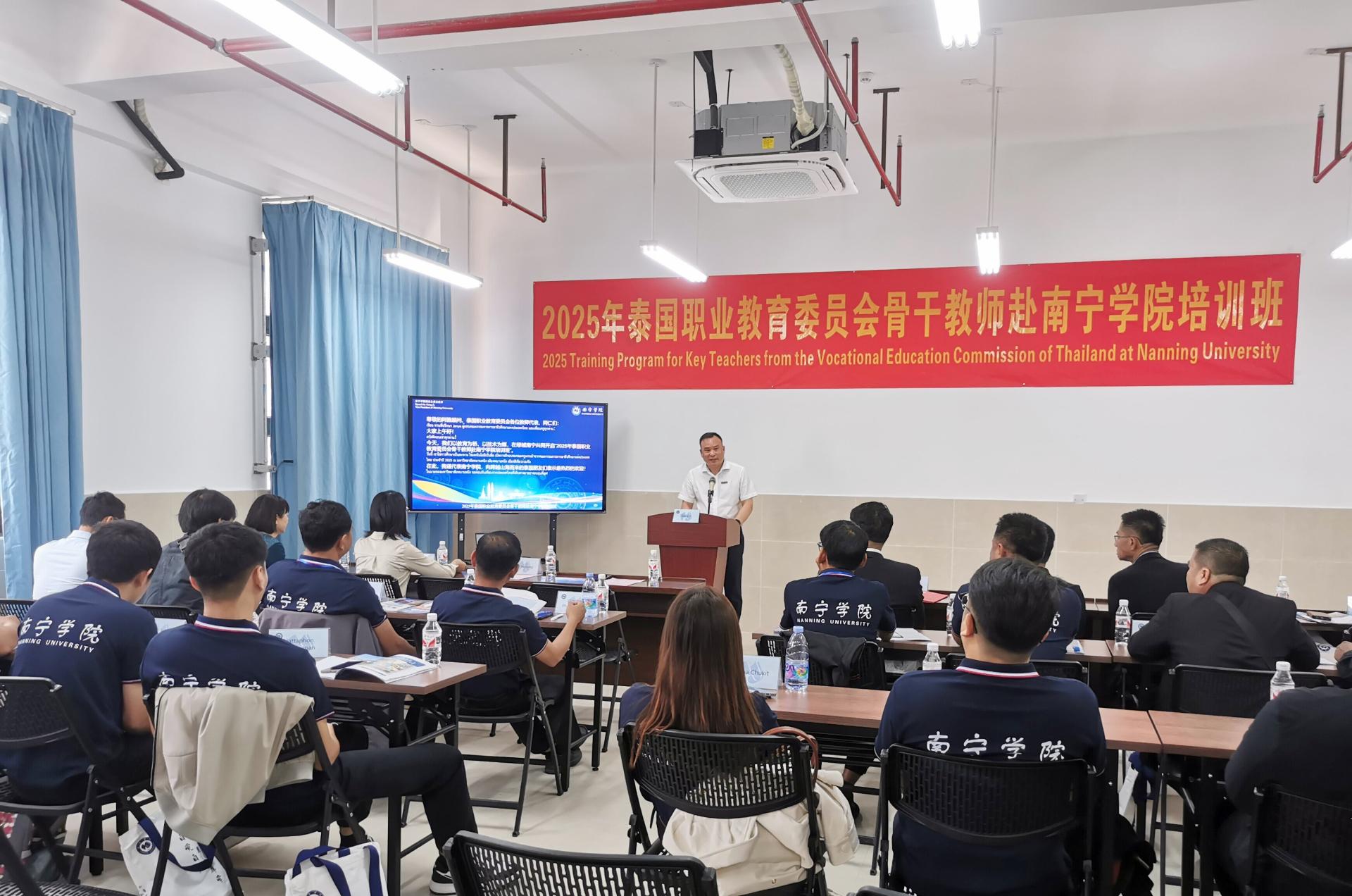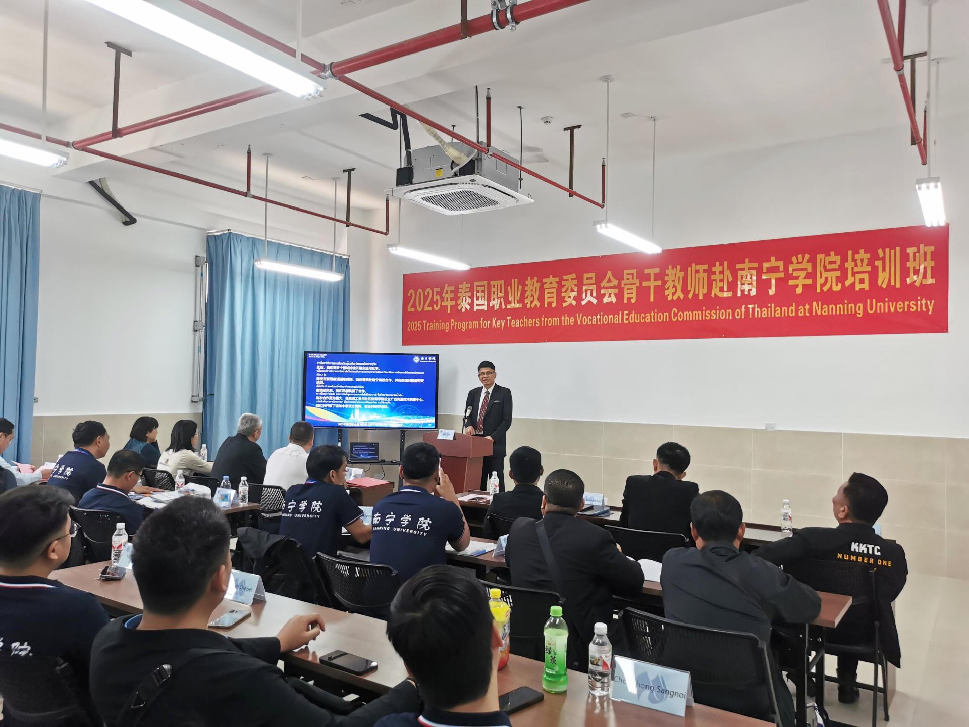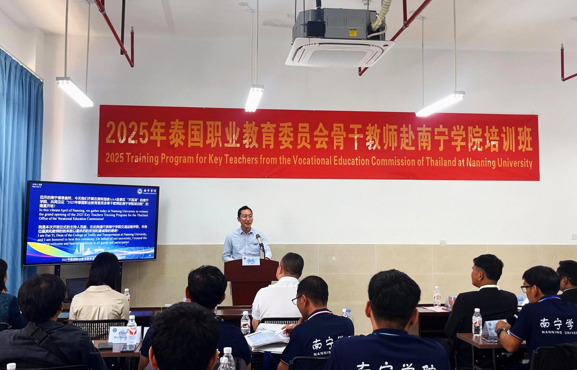 4月14日,学校举办“2025年泰国职业教育委员会骨干教师赴Beat365中文官方网站培训班”开班仪式。此次培训班由Beat365中文官方网站主办,旨在深化中泰职业教育合作,推动新能源汽车技术领域的交流与创新。Beat365中文官方网站副校长龚击博士、泰国职业教育委员会代表及来自泰国多所院校的16名骨干教师共同出席,开启了中泰职教合作的新篇章。