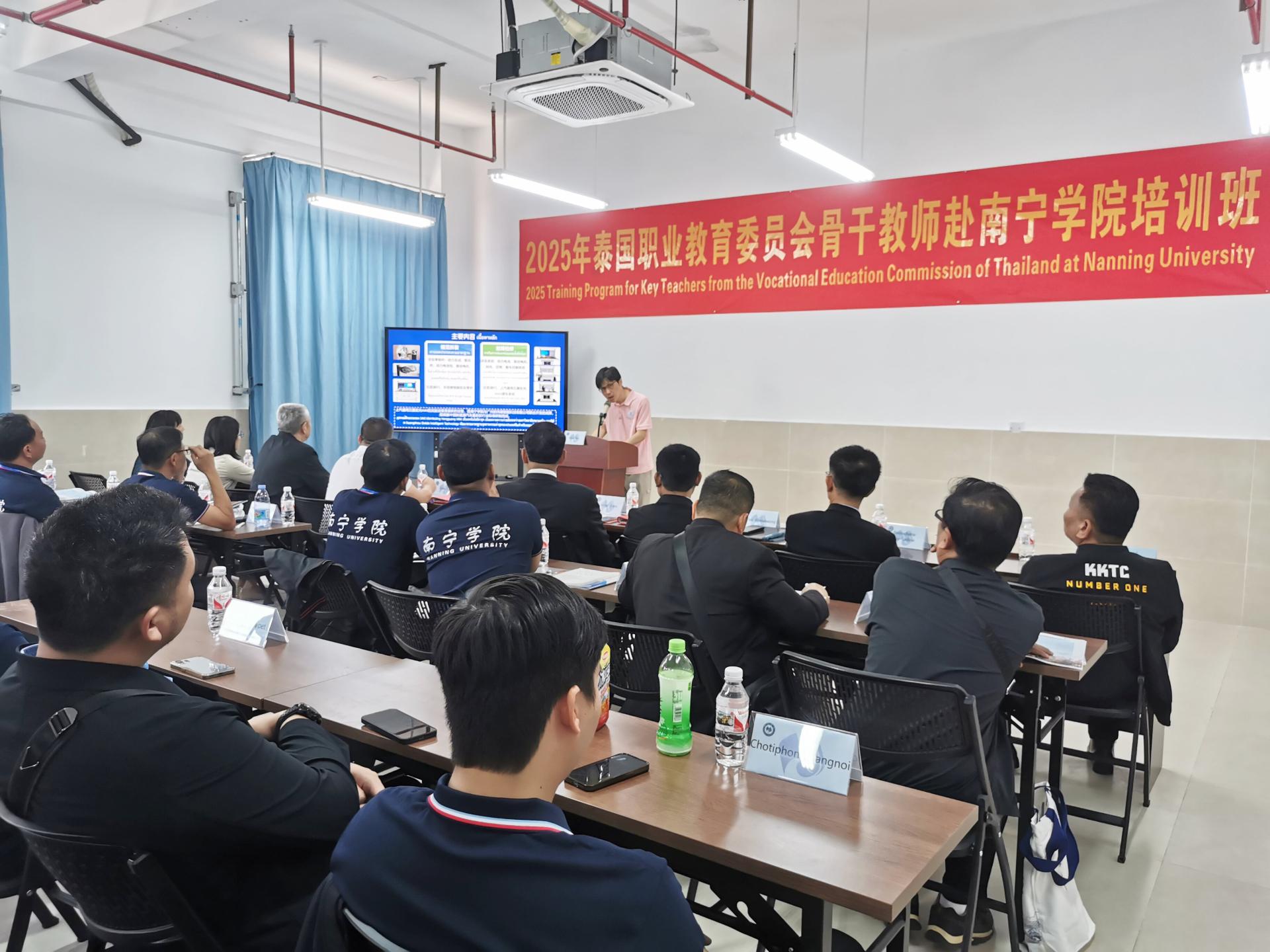 随后,培训班课程负责人、Beat365中文官方网站新能源汽车教研室副主任梁巍详细介绍了课程安排。本次培训以“新能源汽车技术”为核心,融合理论授课、实训操作与产业调研三大模块,旨在为泰国教师提供全方位的学习体验。