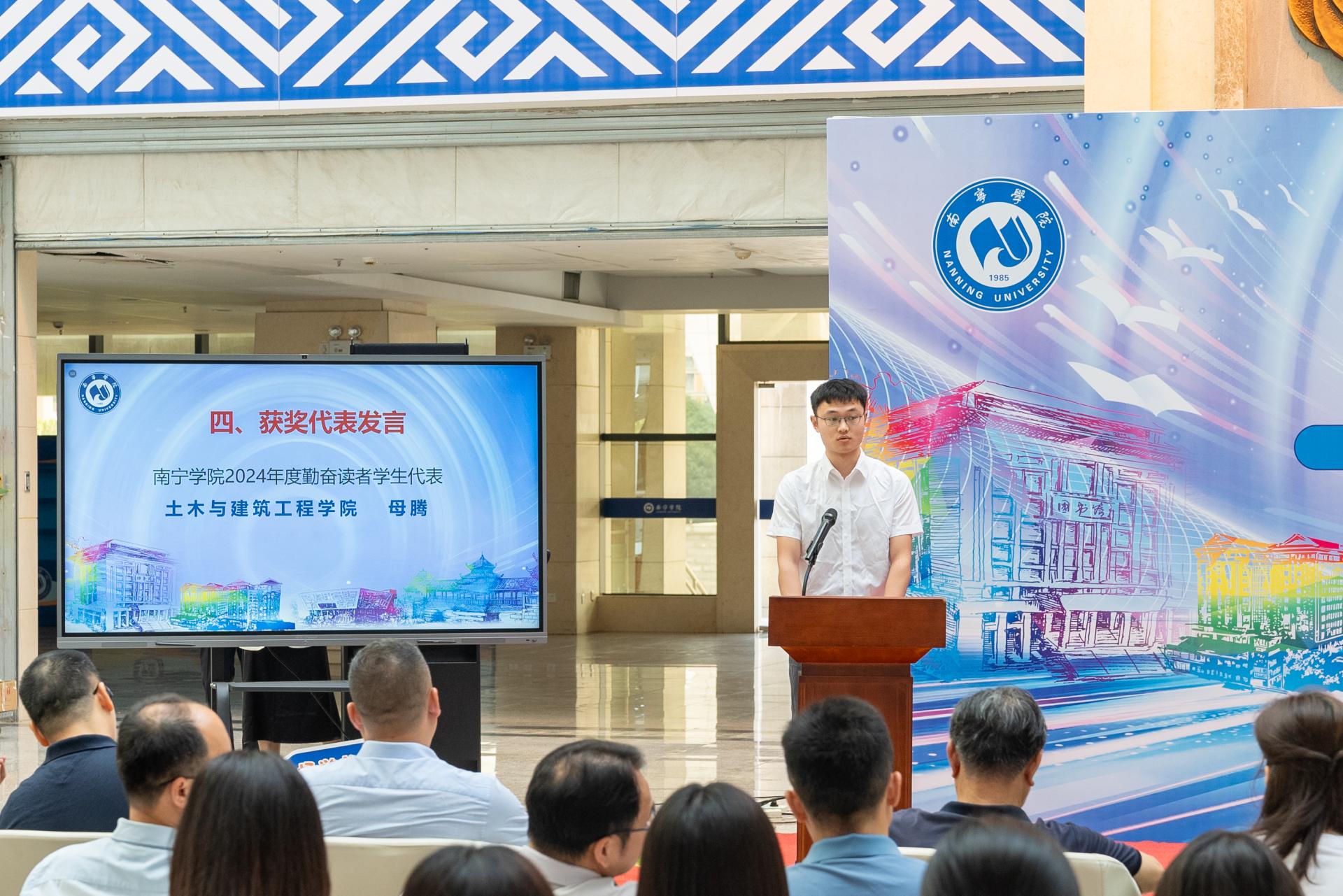 “勤奋读者”学生代表土木与建筑工程学院母腾同学分享读书收获,他表示与图书馆的缘分始于对知识的渴望和对自身匮乏的认知,受学院土梁匠家精神文化的影响爱上了阅读,又在阅读中不断深刻体会到土梁匠家这四个字背后蕴含的丰富内涵。来自商学院的钟依倩老师作为“勤奋读者”教师代表分享读书感想,她说,作为一名青年教师,深知持续学习的重要性,今后将继续以书为伴,不断提升教学能力,与同学们一起在探索中进步,让阅读成为师生共同的习惯。食品与质量工程学院党总支副书记潘炳捷代表“阅读先进单位”发言,他说,学院立足专业特色,紧扣专业特色与人才培养目标,精心制定读书活动方案,兼顾专业学术深耕与人文素养拓展,通过积极组织专业阅读分享会、跨年级“书海接力”“美食文学品鉴沙龙”等读书活动厚植学院文化根基,赋能师生成长未来。