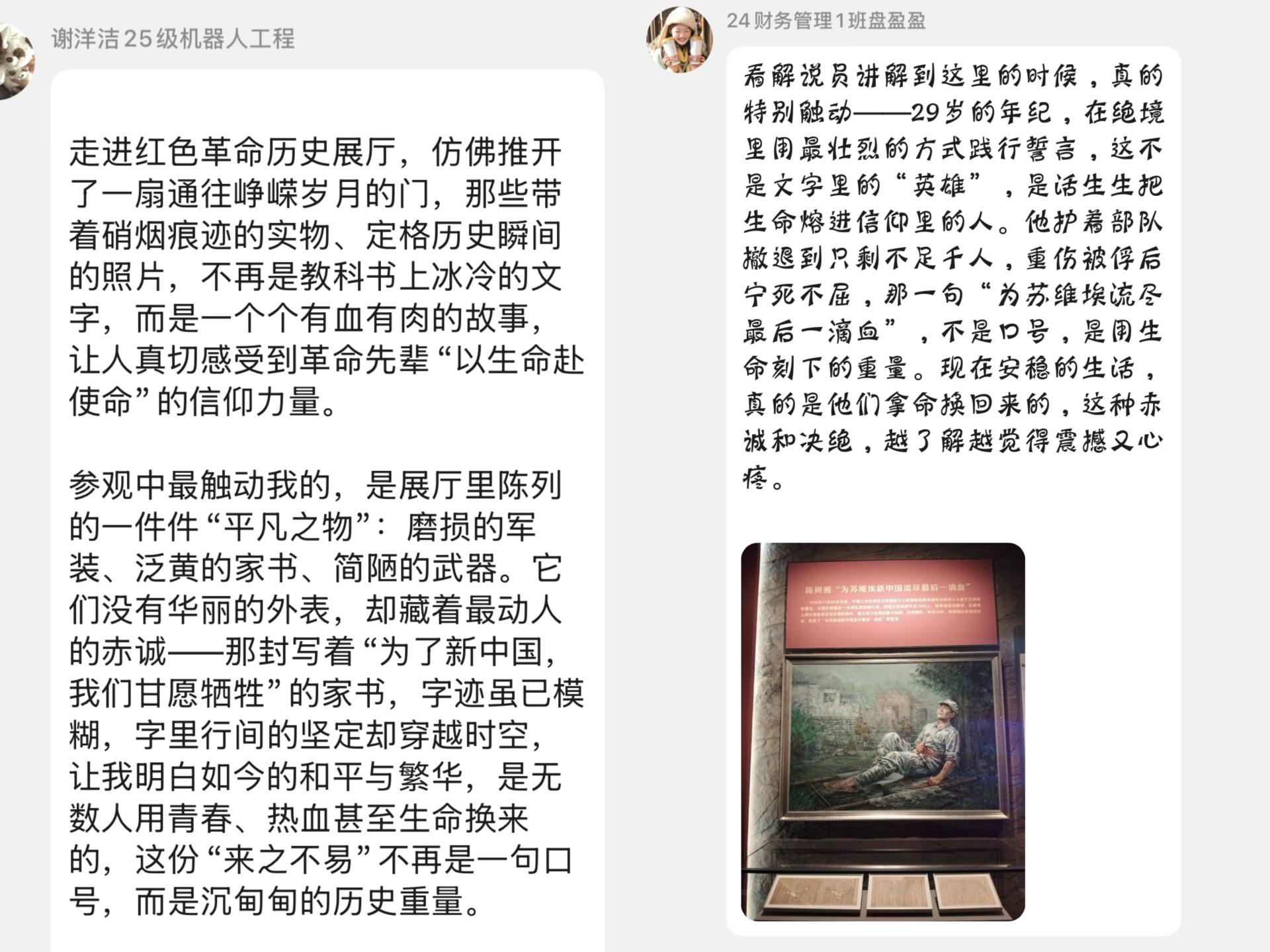 实践教学的深度,体现在学生对历史的主动思考与感悟表达中。让学生置身历史场景,通过视觉、听觉的多重冲击激发情感共鸣。参观过程中,师生围绕“广西人民的革命担当”“先辈精神的当代价值”等话题展开讨论,学生们结合自身专业与生活实际,分享对革命精神的理解。23级数据科学与大数据技术1班的李美贤同学被“我们广西人历来是打头阵的”这句展区标题深深触动,她表示:“作为广西青年,更要传承这份坚韧,用专业能力为家乡发展贡献力量。” 23级数据科学与大数据技术1班的杨宗才在展馆的留言簿上写下:“回首过去,展望未来,让我更加坚定永远跟党走!”