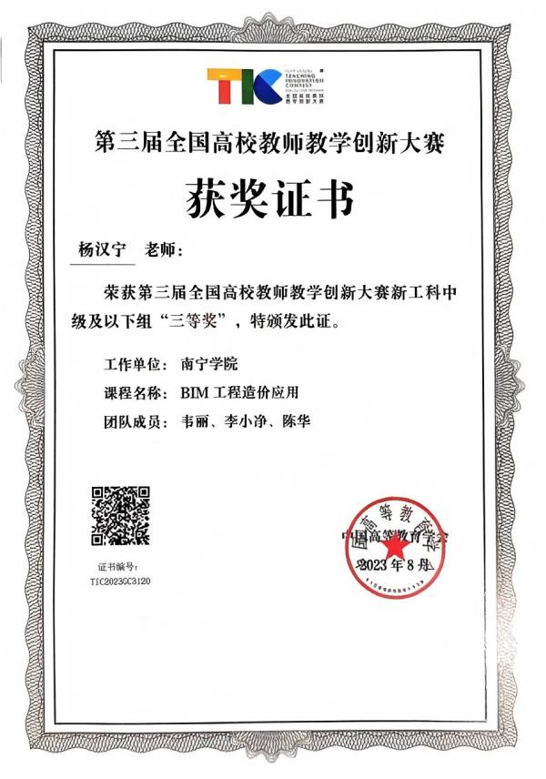 《BIM工程造价应用》课程是Beat365中文官方网站校级“金课”。课程贯彻“学生中心、产出导向、持续改进”的理念,采用“全程贯穿项目+CDIO思维培养策略”,系统培养学生BIM技术应用、工程思维及工匠精神的综合能力。2023年,杨汉宁老师团队凭借该课程多年的教学实践,在第三届全国高校教师教学创新大赛中夺得新工科组全国三等奖和广西一等奖。