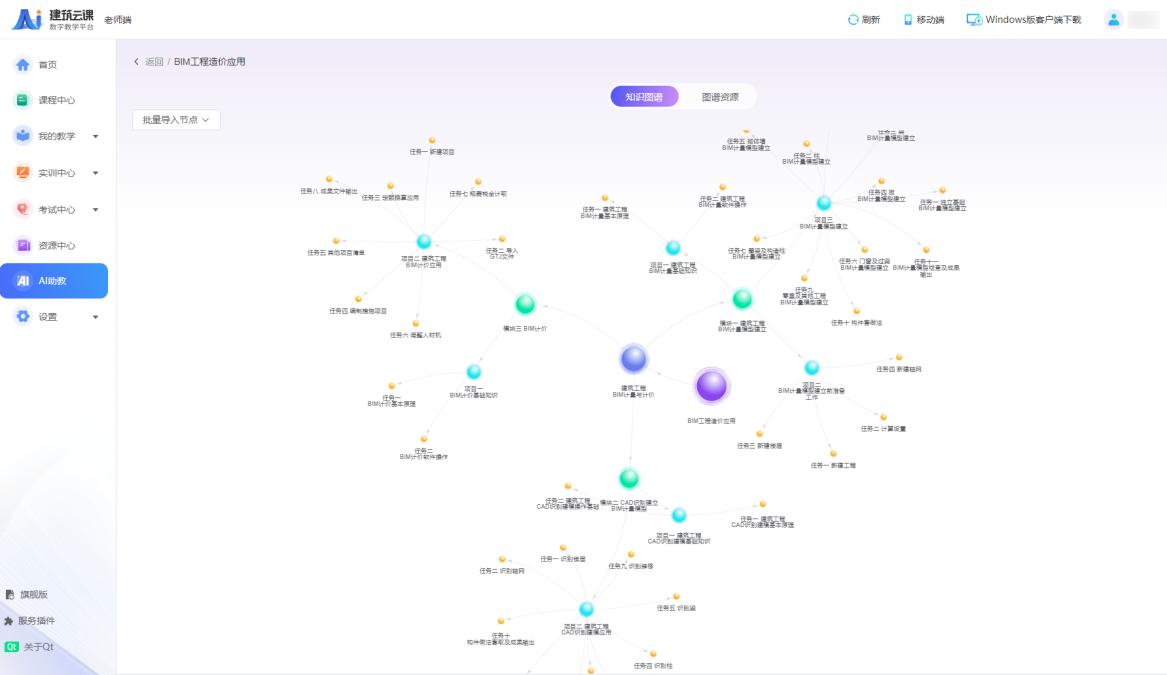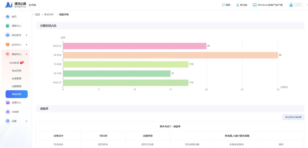 平台智能化赋能远不止于考核。集成“AI助教”系统为“教”与“学”的全过程提供了强大支持:教师可利用“AI出题”功能,快速生成与教学目标精准匹配的习题库;通过构建可视化的课程“知识图谱”,系统化地梳理与深化知识关联;学生则可随时调用“AI助手”进行智能问答,获得即时的个性化学习辅导。这些功能共同构建了一个从智能备课、互动学习到精准评价的完整数智化教学环境,有效提升了教学效率与学习体验。