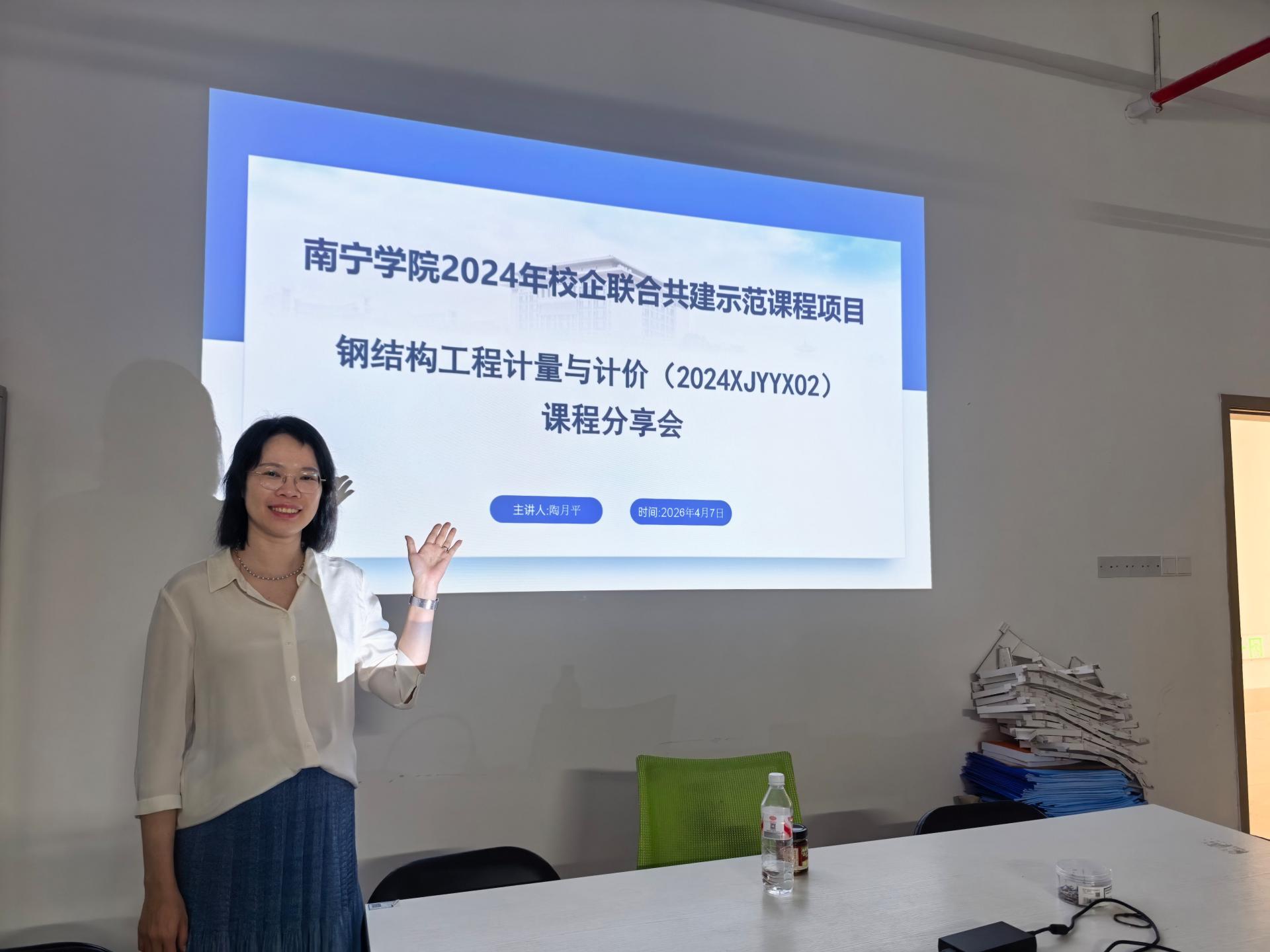 2026年4月7日下午,土木与建筑工程学院《钢结构工程计量与计价》课程建设分享会于东盟楼A907顺利举行。本次分享会由课程负责人陶月平老师主持,课程组全体教师、教研室相关教师参会,校企合作单位祥浩工程造价咨询有限责任公司代表以线上形式参会。分享会紧扣“校企合作、协同育人”核心主题,展示课程在“校企协同+三育融合”教学改革中的实践成效,系统梳理校企联合共建课程的宝贵经验。