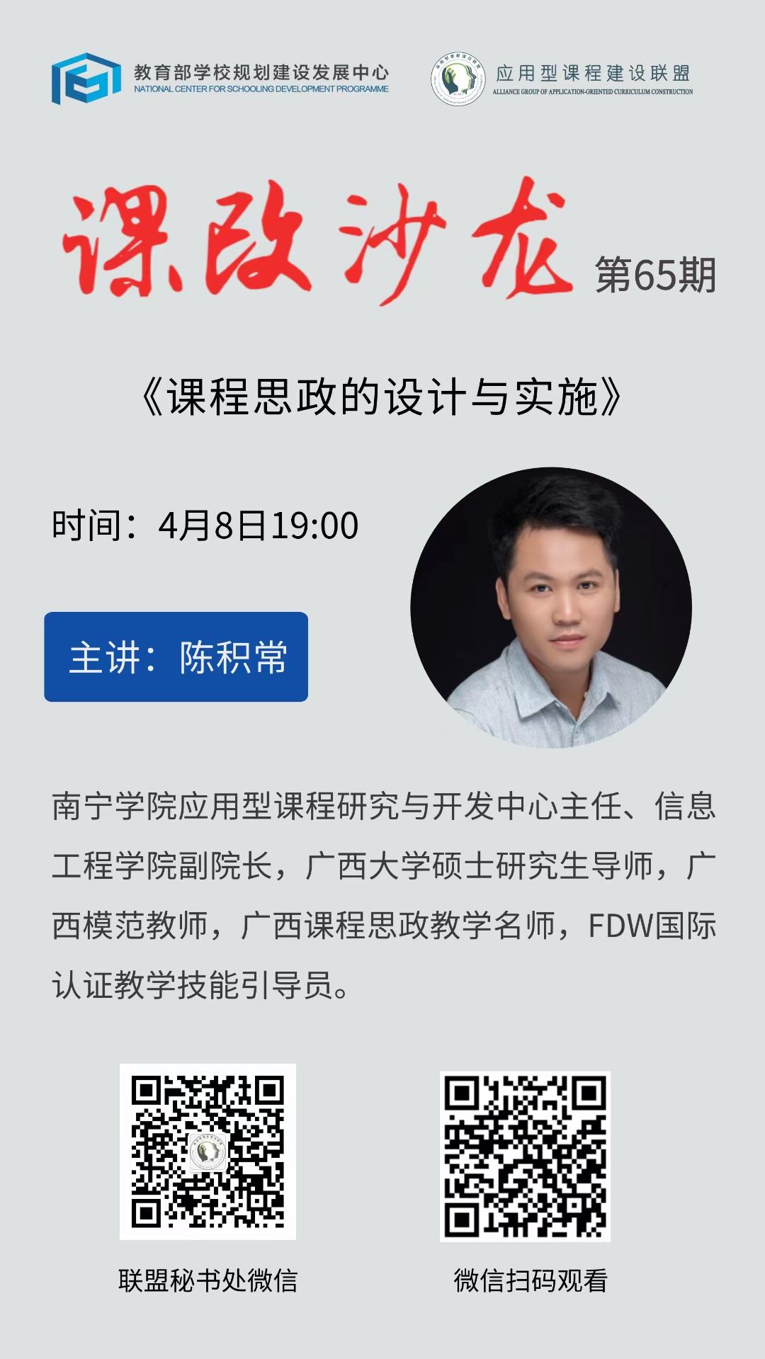 4月8日,由教育部学校规划建设发展中心、应用型课程建设联盟主办的“课改沙龙”活动在线上召开。本次课改沙龙聚焦“课程思政”主题,我校信息工程学院陈积常教授做“课程思政的设计与实施”主题报告分享,会议由应用型课程建设联盟秘书长张振笋教授主持,线上参会人数达到2000多人次。