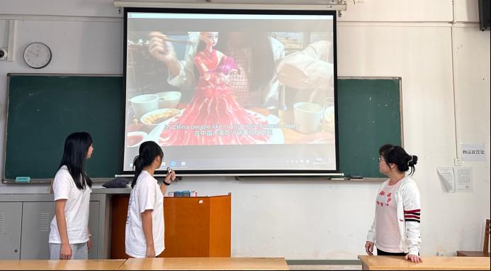 此次课程成果汇报选择了传播优秀中华文化的学生优秀作品进行展演。学生通过PPT、视频、报告等多种方式,展示了他们语言实践的学习成果,引起了参观者的强烈兴趣。其中,《春节》、《火锅》、《中华书画》、《剪纸》四个优秀项目小组分别进行了展演并回答了同学的提问。这四个项目展示了学生在传统文化保护、中外文化交流等方面的探索,反映出同学们开阔的国际视野和担当新时代使命的决心。此外,同学们在汇报和答辩中分享了从线上策划、脚本设计到线下拍摄,作品打磨直至上传社交平台展示过程中的实践心得体会,体现了学生深度参与学习,深化语言实践的成果。