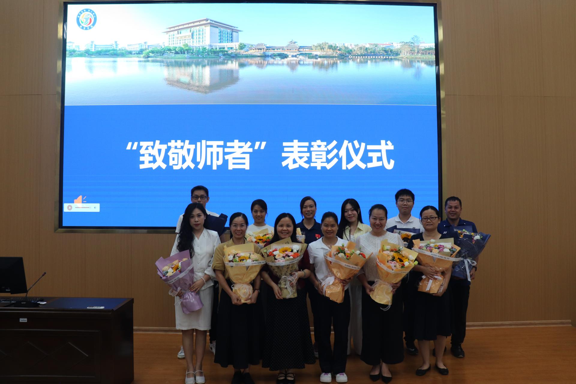 在“致敬师者”表彰仪式环节,黄书记宣读了荣获2024年度“不孤荣誉奖”、教学竞赛奖项及2024-2025学年党内评先评优的教师名单。学生礼仪代表满怀敬意地向受表彰的教师们敬献鲜花,现场响起热烈掌声,向身边的榜样致以崇高敬意,充分营造了崇尚先进、学习先进、争当先进的浓厚氛围。