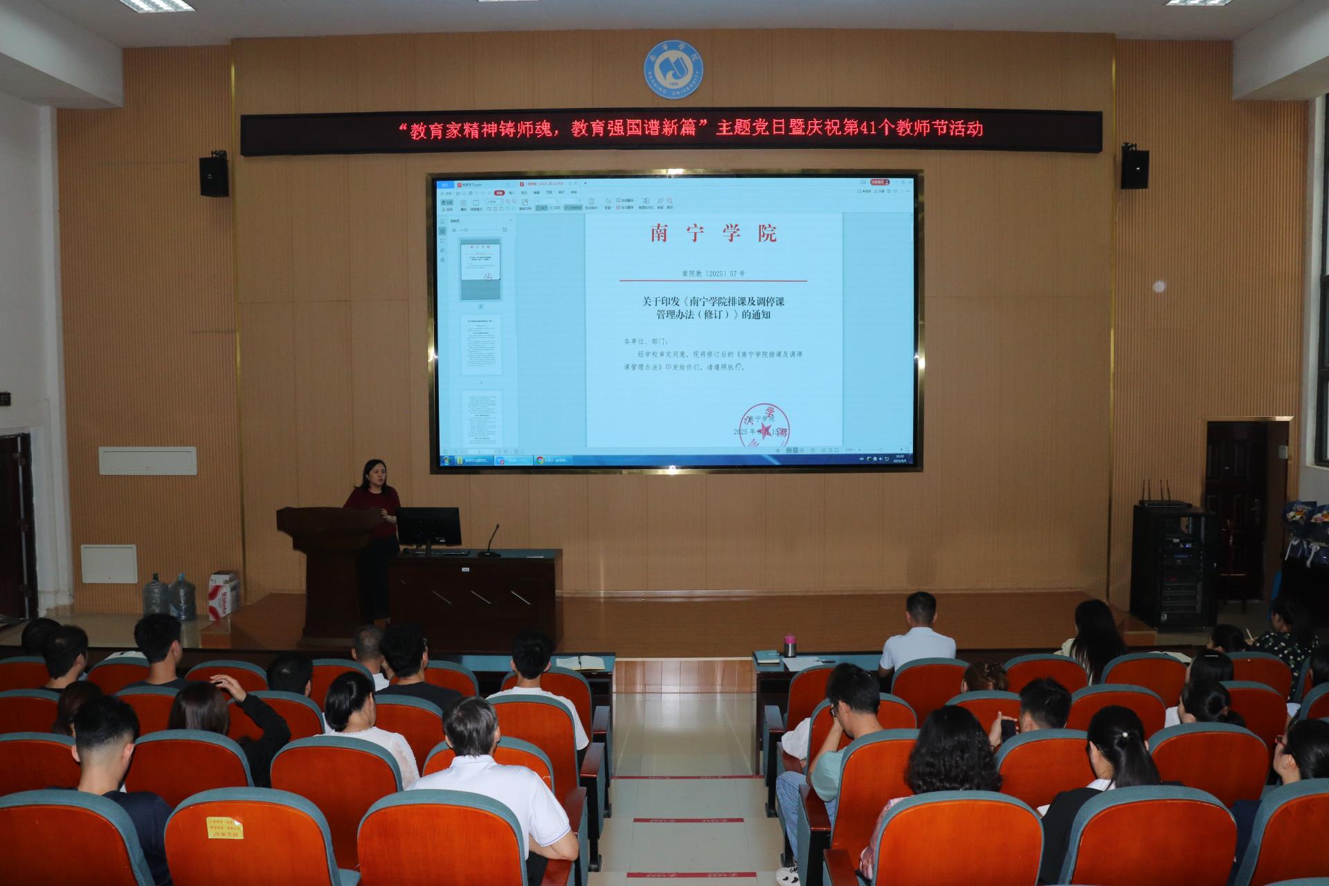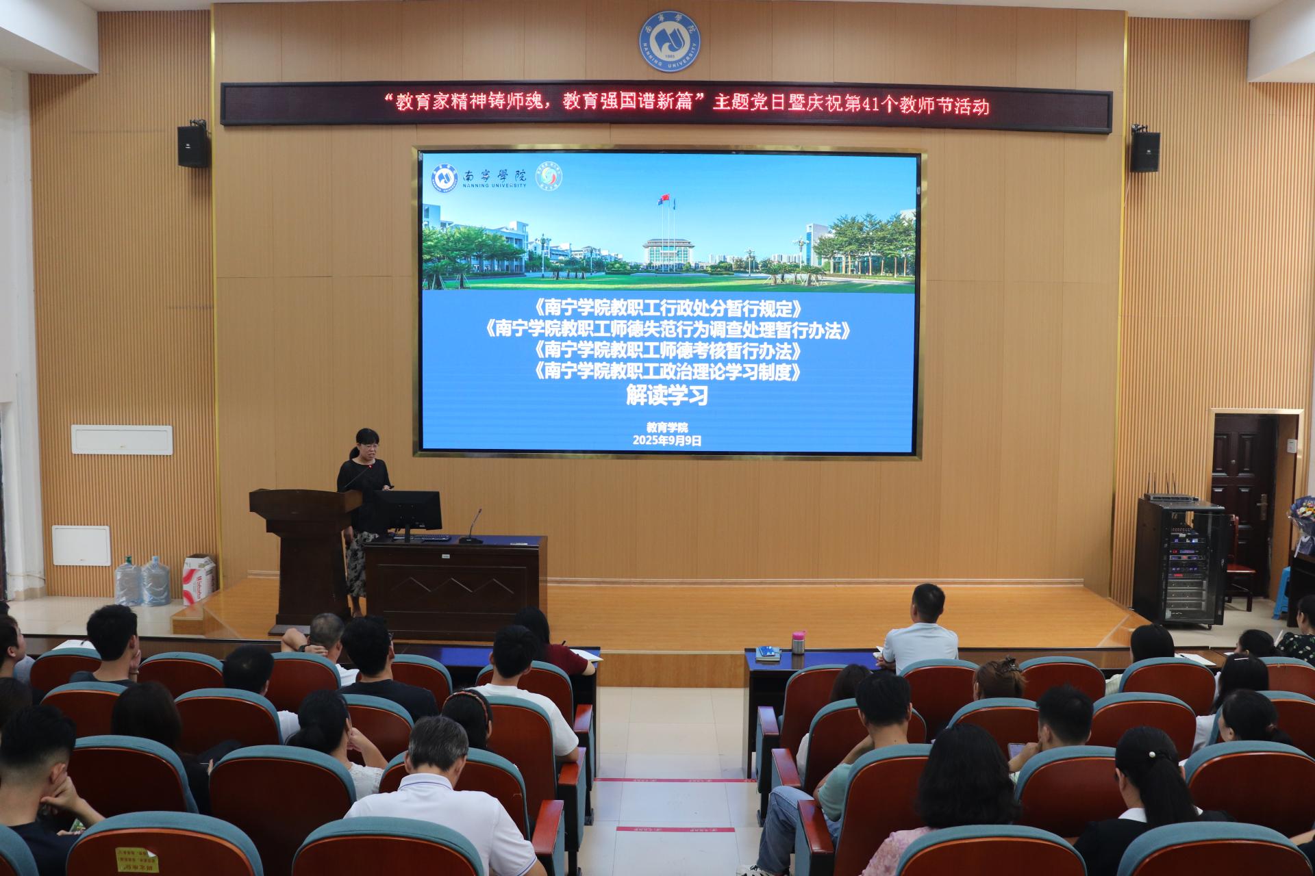 在喜迎第41个教师节之际,为深入学习贯彻习近平新时代中国特色社会主义思想,大力弘扬教育家精神,进一步加强师德师风建设,激励全体教师党员坚守立德树人初心,担当为党育人、为国育才使命,教育学院党总支于2025年9月9日下午,在南硅谷D104阶梯教室隆重举行“教育家精神铸师魂,教育强国谱新篇”主题党日暨庆祝第41个教师节活动。学院全体教职工及入党积极分子共计60余人参加了此次活动。