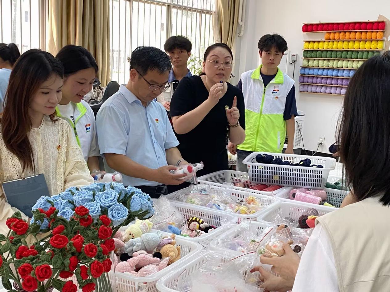在南宁市残疾人事业服务协会秘书长韩燕妮、金融助残部常务副部长张春辉的陪同下,调研组一行实地参观了残疾人活动中心,深入了解残疾人康复训练、技能培养及社会融入等多元化服务平台的运作模式,切身感受精准助残服务的温度与深度。在蚕豆工坊就业帮扶车间与就业创业直播基地中,师生们了解到“技能培训+多元就业”双轮驱动模式,为残障人士搭建起可持续的就业赋能平台。蚕豆工坊就业帮扶车间依托手工制作产业,引导残障人士通过参与蚕豆工艺品制作、非遗手作等特色项目实现稳定增收,逐步构建起“劳动创造价值”的良性循环。随后,在协会秘书长韩燕妮的陪同下,走访团队走进数字化、智能化心理健康共建基地,深入了解基地依托前沿科技搭建的心理健康检测系统,并有机会体验了脑波测试技术、VR疗愈等科技助残项目。该系统通过精准筛查心理健康状况,基于检测结果联动专业心理咨询师团队,提供个性化、定制化的心理健康干预方案,为残障群体心理健康保驾护航,展现出科技助残的创新实践与人文关怀。