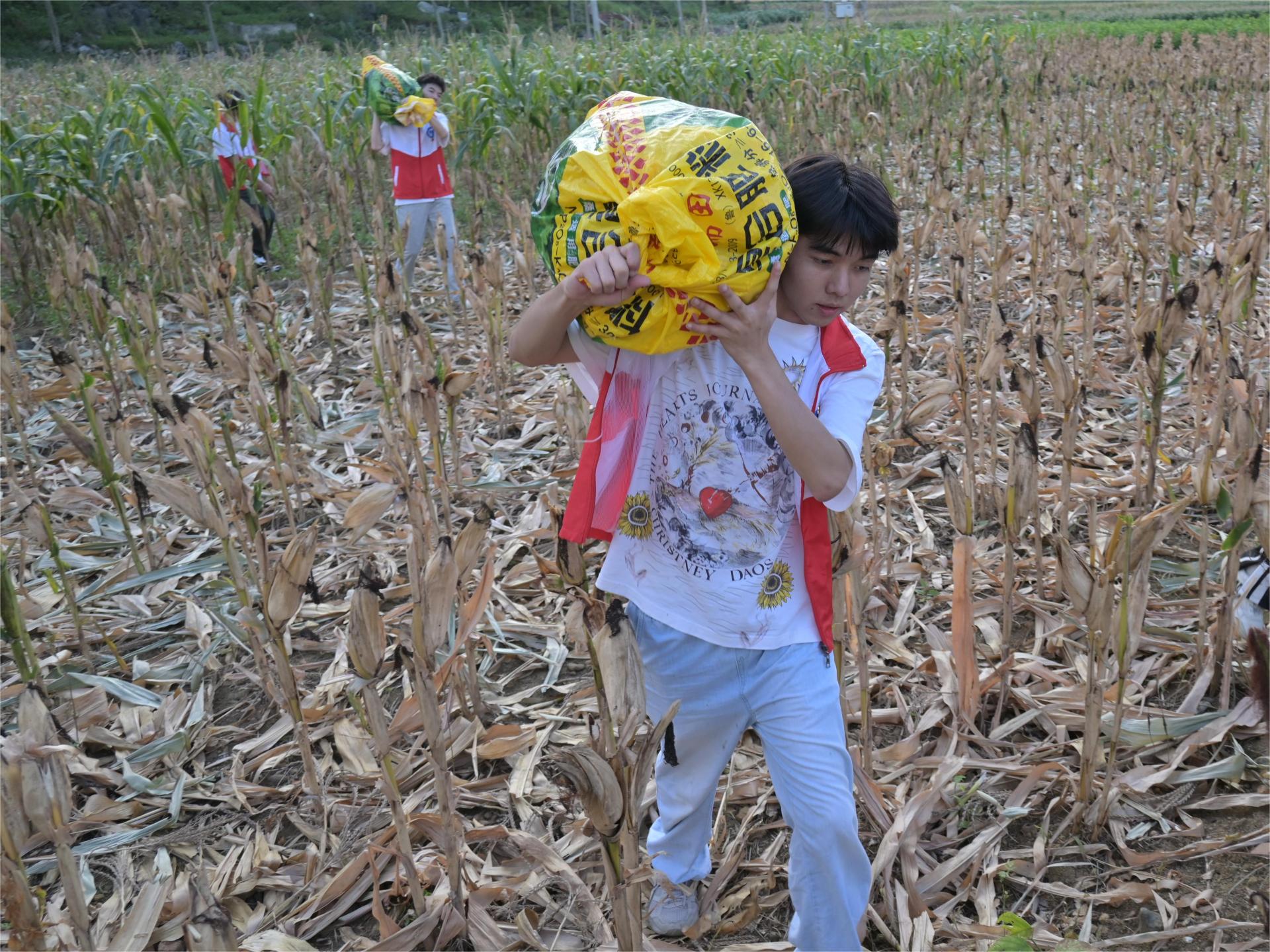 促进团成员们帮助年迈的村民将玉米扛回家