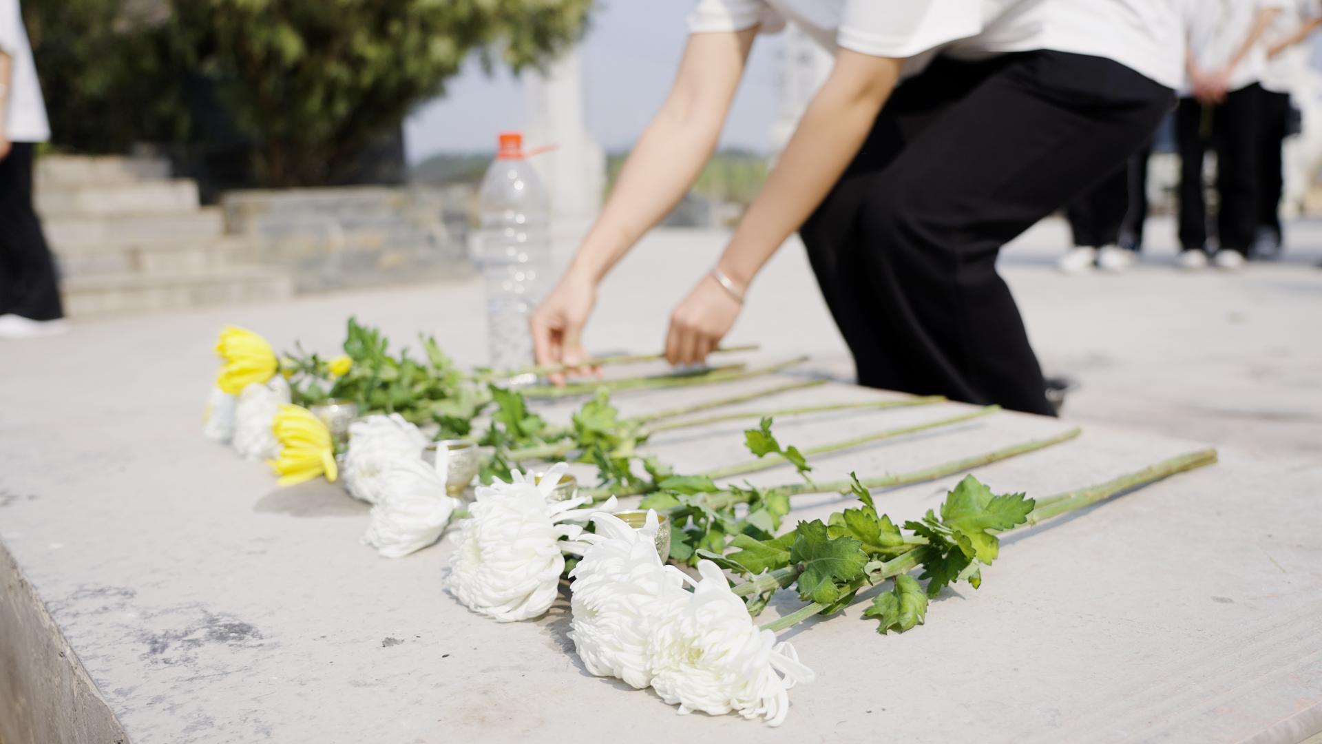 学生代表为烈士洗脸、敬献菊花