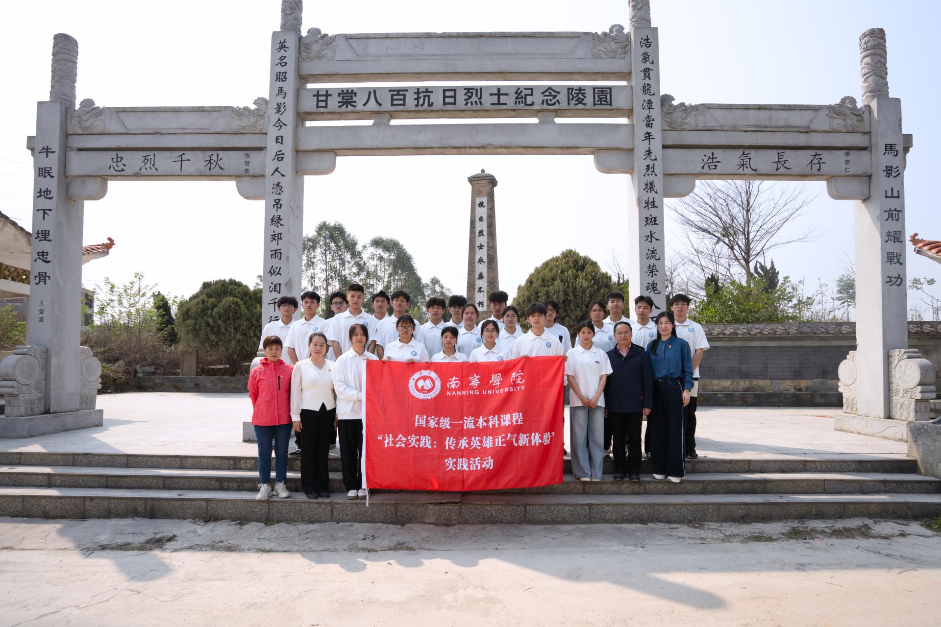 在清明节来临之际,3月22日,由“社会实践(传承英雄正气新体验)”教学团队与2024级体育教育1-2班和西安培华学院交换生共同组成的修读“固边之基:广西做足边的文章”同学们来到宾阳县“甘棠八百抗日烈士纪念陵园”,开展“缅怀革命英烈 传承英雄精神”主题实践教学活动。