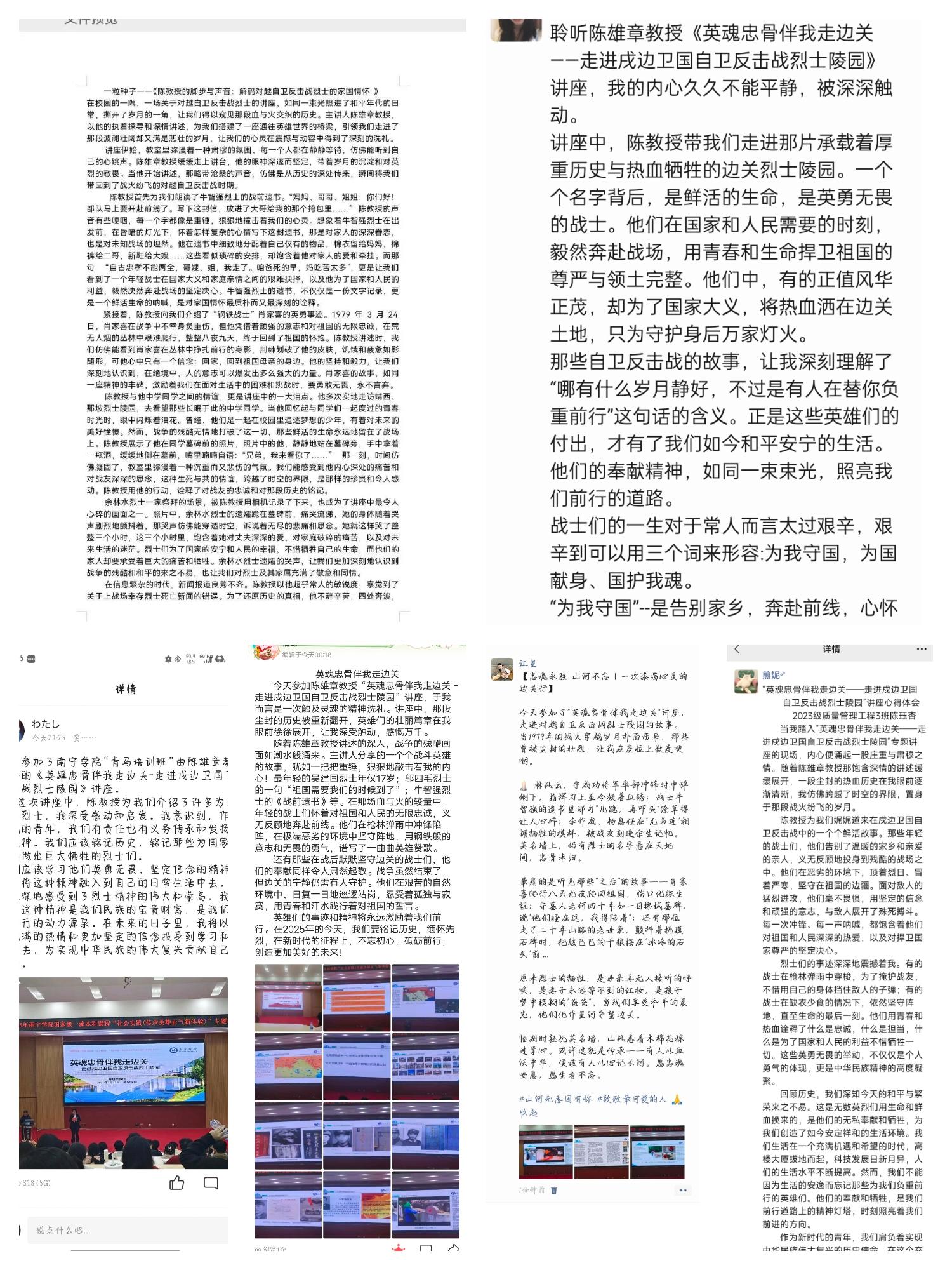 陈教授围绕戍边卫国自卫反击战英烈事迹、烈士陵园中的英雄正气、致敬戍边卫国卫士三个主题,以丰富的历史数据和事实,再现了英烈们的英勇赤诚,带领师生深入领悟英雄精神,激发传承红色基因、弘扬英雄正气的热情,现场氛围庄重肃穆,师生动容动情,引发强烈情感共鸣。陈教授团队二十余年如一日,走遍广西边境的每一座烈士陵园,用脚步丈量英雄足迹,用文字记录浩然正气。这种躬身实践的精神,不仅让课程成为“感动万千学子”的爆款,更让英雄精神在新时代焕发出蓬勃生机。