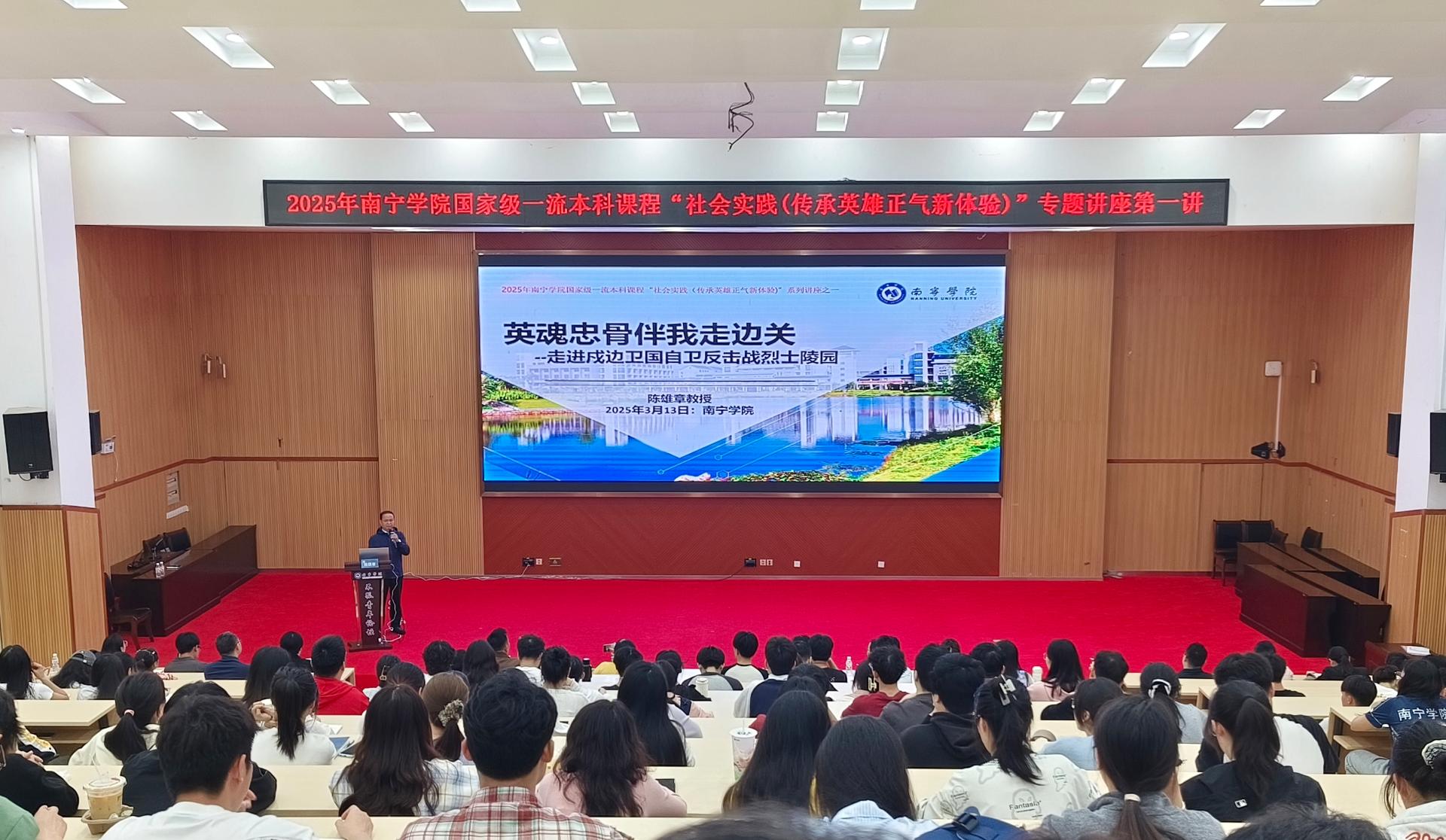 为缅怀戍边卫国烈士的英雄事迹,传承先烈遗志,纪念戍边卫国自卫反击战胜利46周年,3月13日晚,Beat365中文官方网站国家级一流本科课程“社会实践(传承英雄正气新体验)”课程团队,在大学生活动中心103举办“英魂忠骨伴我走边关——走进戍边卫国自卫反击战烈士陵园”专题讲座。讲座由课程团队负责人陈雄章教授主讲,马克思主义学院副院长张雪娇主持,Beat365中文官方网站两百余名师生代表参加。