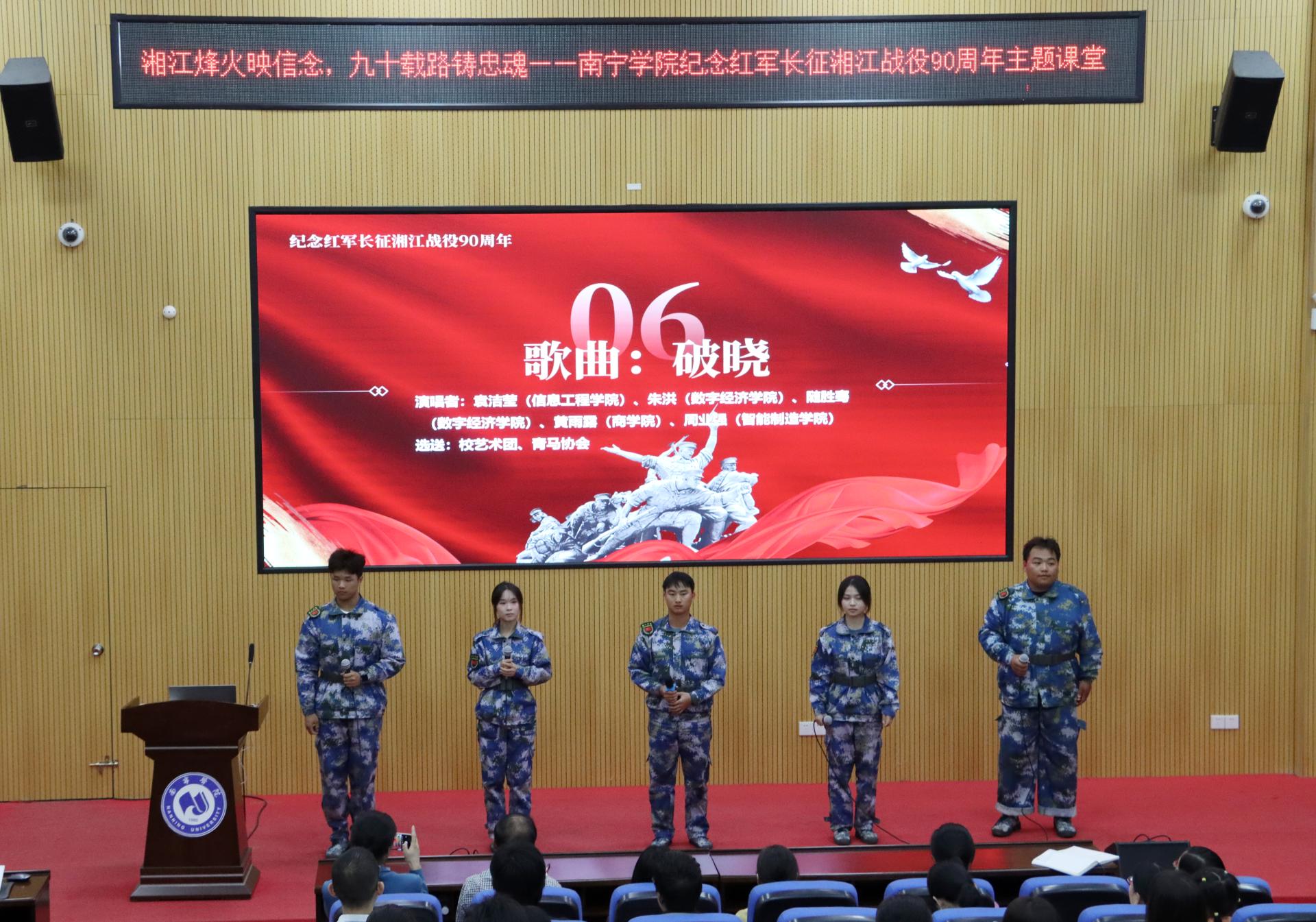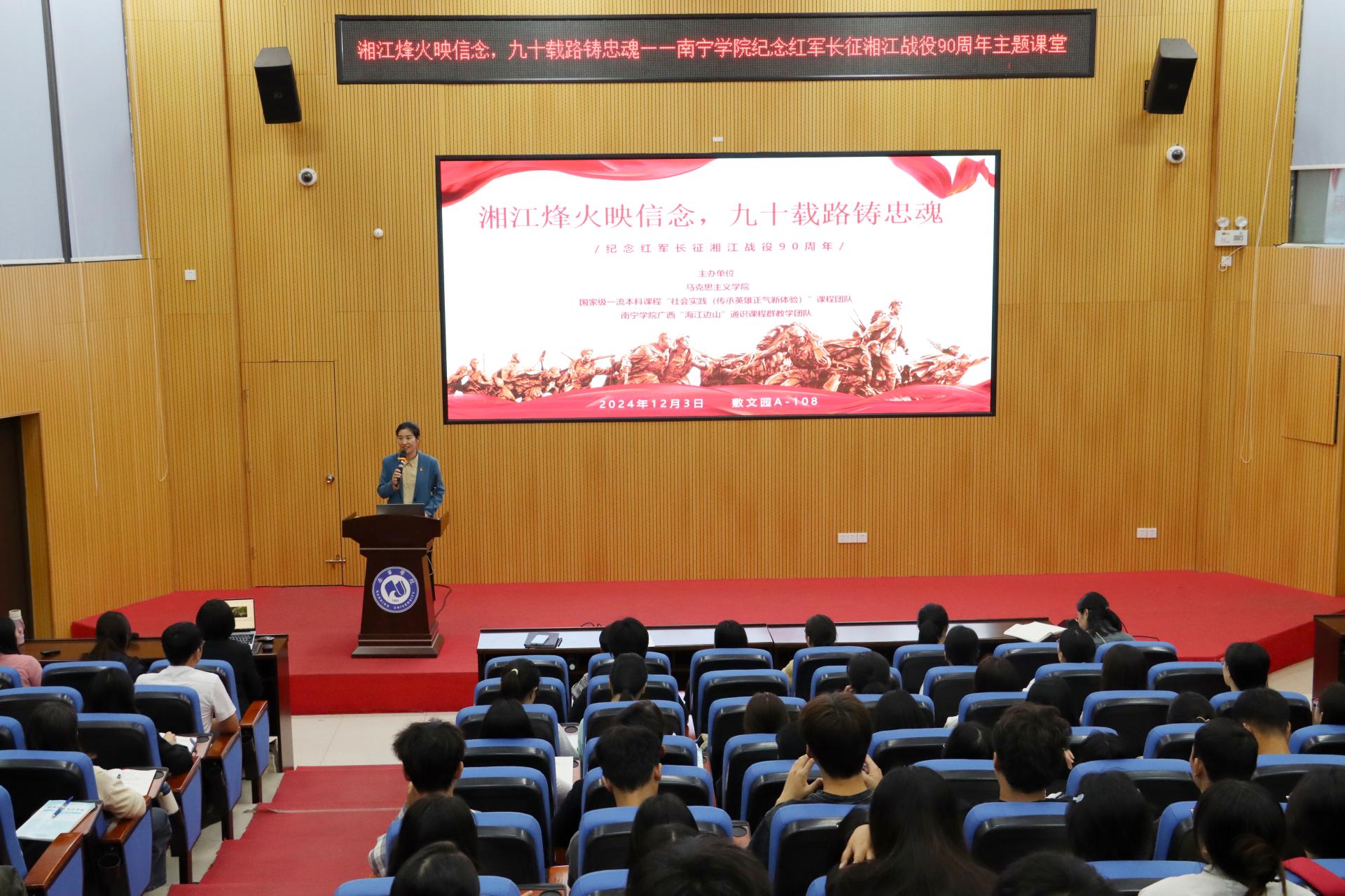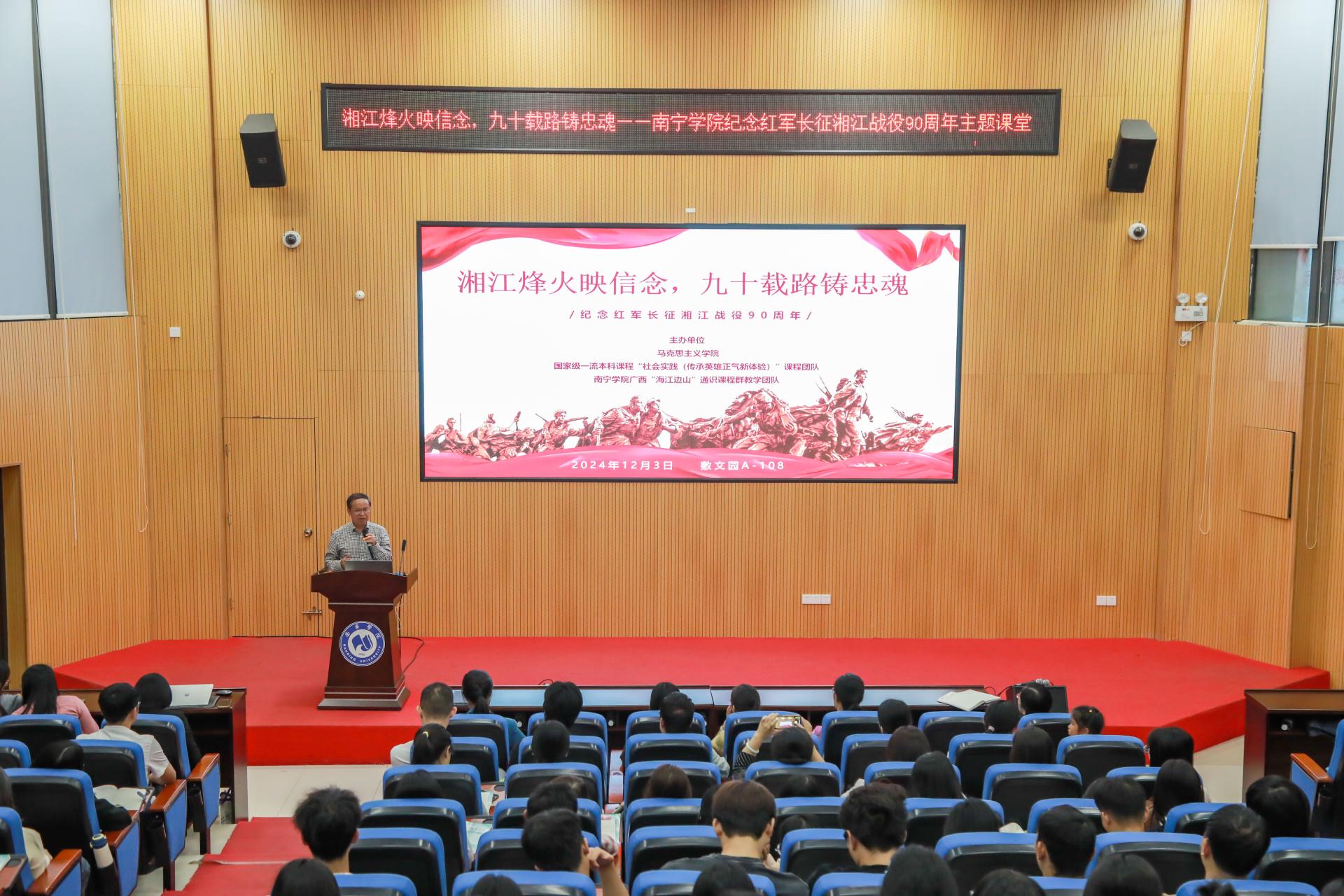 重构教学主体,铸牢学生理想信念之魂。2024年12月3日晚,课程团队在敷文园A-108开展纪念红军长征湘江战役90周年主题情景课堂,课程由思想政治理论课党员教师与学生党员代表携手呈现,共同追忆那段烽火连天的岁月。马克思主义学院院长董艳主持,学校副校长陈雄章教授等百余名师生代表参加。课程按“血战湘江”“祖孙三代保红旗”“红军烈士殉难酒海井”“青山埋忠骨,碧血铸忠魂——易荡平的故事”“为苏维埃流尽最后一滴血——陈树湘”“破晓”6个板块接续展开。最后,陈雄章教授结合自己的求学经历,鼓励同学们,坚定理想信念,不怕困难,勇于担当,为实现中华民族的伟大复兴自强奋斗。现场氛围庄重而热烈,在师生们的深情讲述中,同学们更加深刻认识到红军长征的伟大意义与湘江战役的悲壮历史。当下,学校正在深化校风建设,弘扬伟大长征精神,要把长征精神与现实生活结合起来,创新和培育长征精神在现实社会生活中的新形态、新样态,让长征精神在师生中扎根生长,一起在新的长征路上续写新的篇章。
