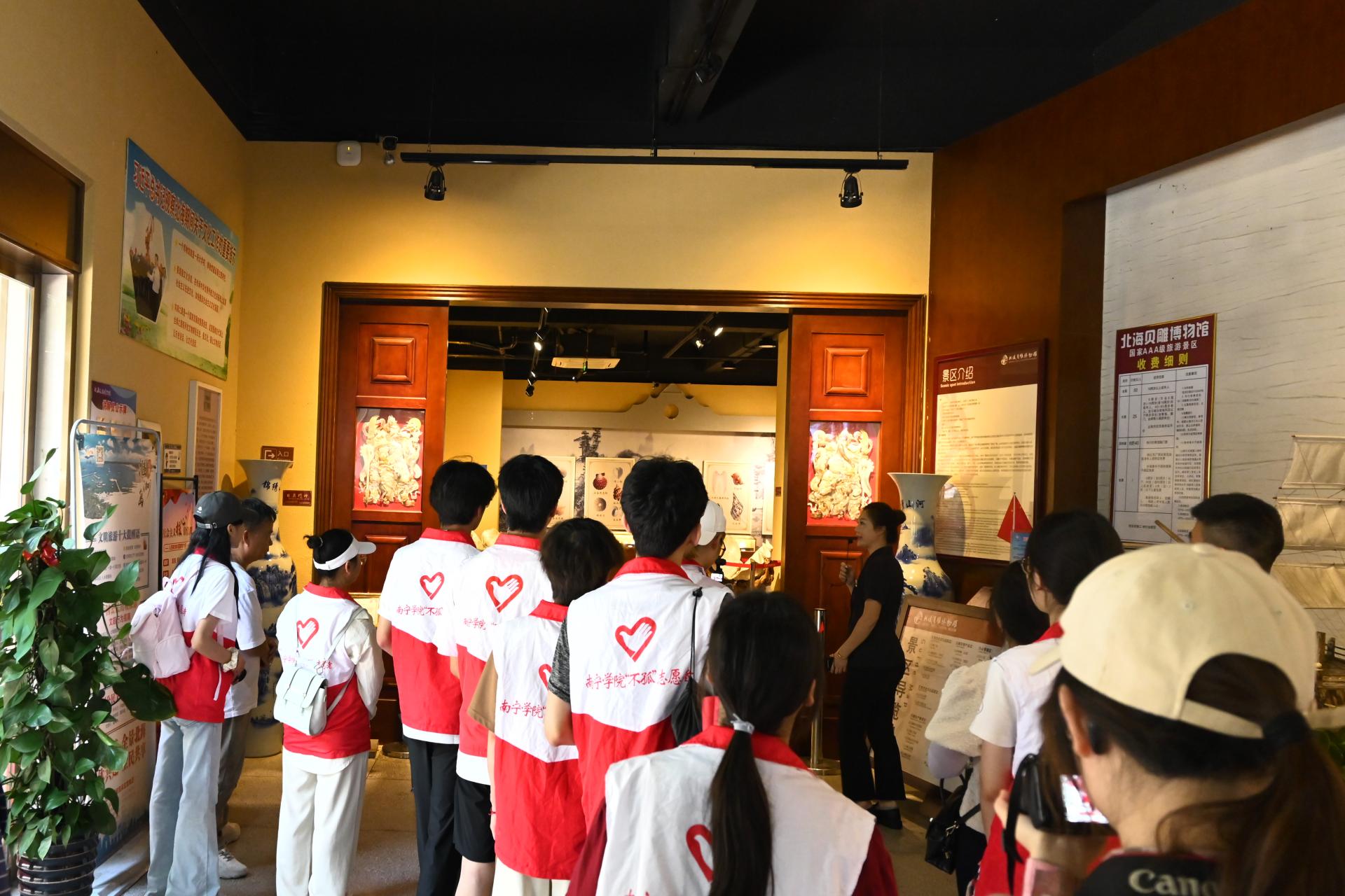 下午,实践团队走进北海贝雕博物馆,正式展开了非遗文化的探索之旅。踏入博物馆展厅,琳琅满目的精美贝雕展品瞬间吸引了成员们的目光,其巧夺天工的工艺令人震撼。专业讲解员以贝雕的起源为切入点,引领大家穿越历史长河。在讲解员的解说下,成员们沉浸在这跨越时空的艺术演变之中,深刻感受着贝雕艺术的独特魅力与深厚底蕴。
