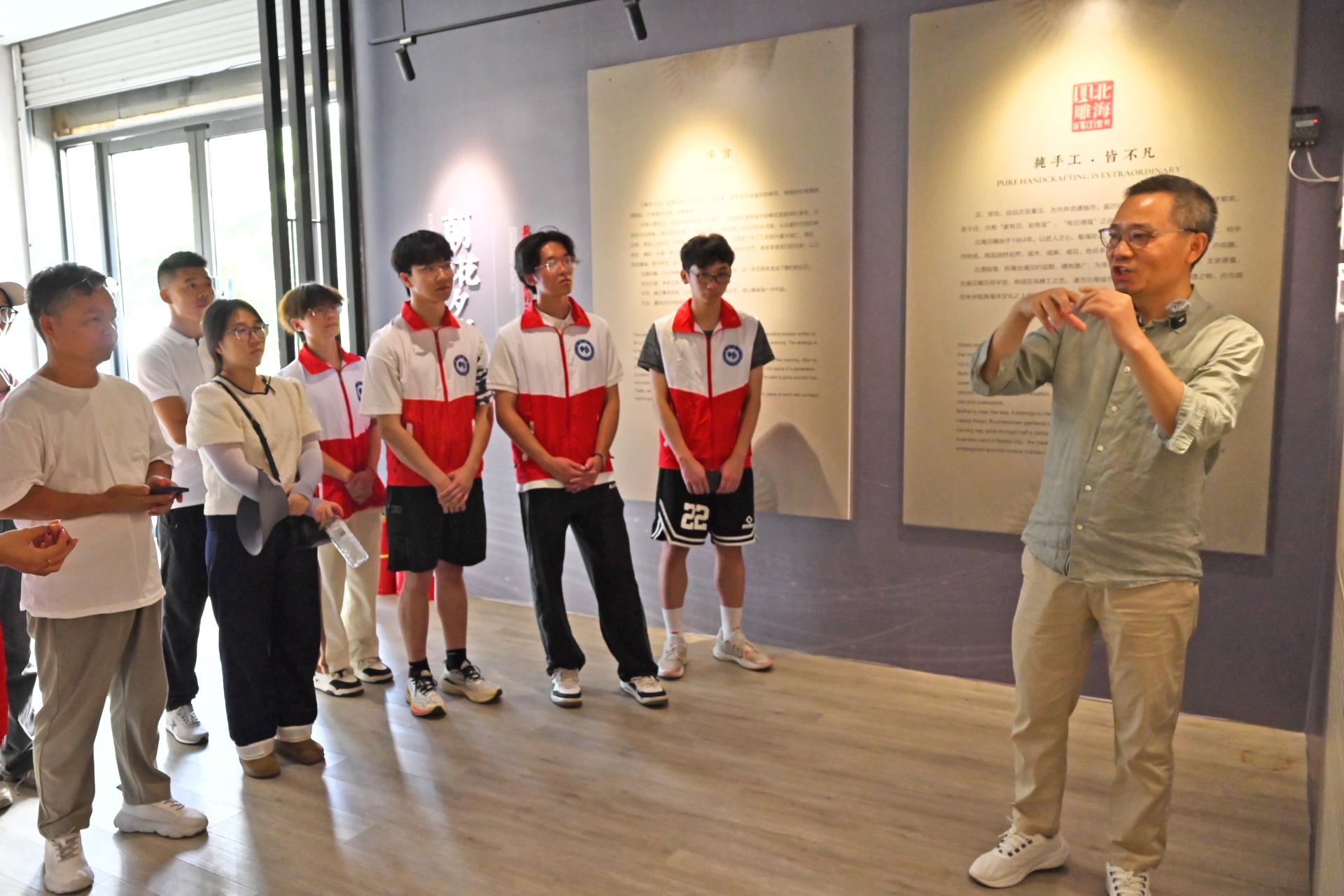 随后,实践团一行来到“传艺”贝雕家居文化馆,与北海市非物质文化遗产保护协会秘书长何明军共话非遗传承创新。交流中,何明军秘书长深入解读工作室牌坊上“传艺”二字的内涵。他指出,“传艺”承载着文化使命,核心是期望年轻一代接力传承贝雕技艺,以“朝花夕拾”作喻,强调当代人应传承前辈培育的艺术之花,让非遗在新时代绽放。