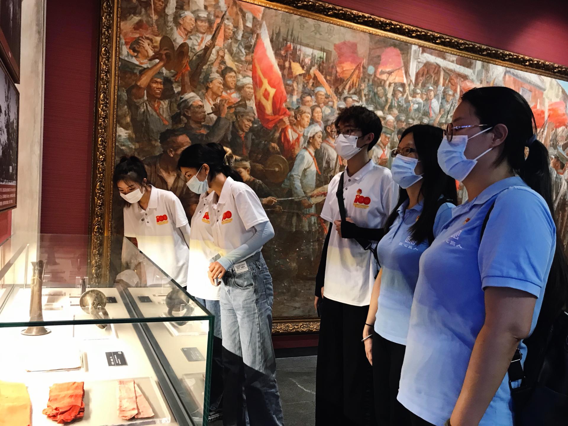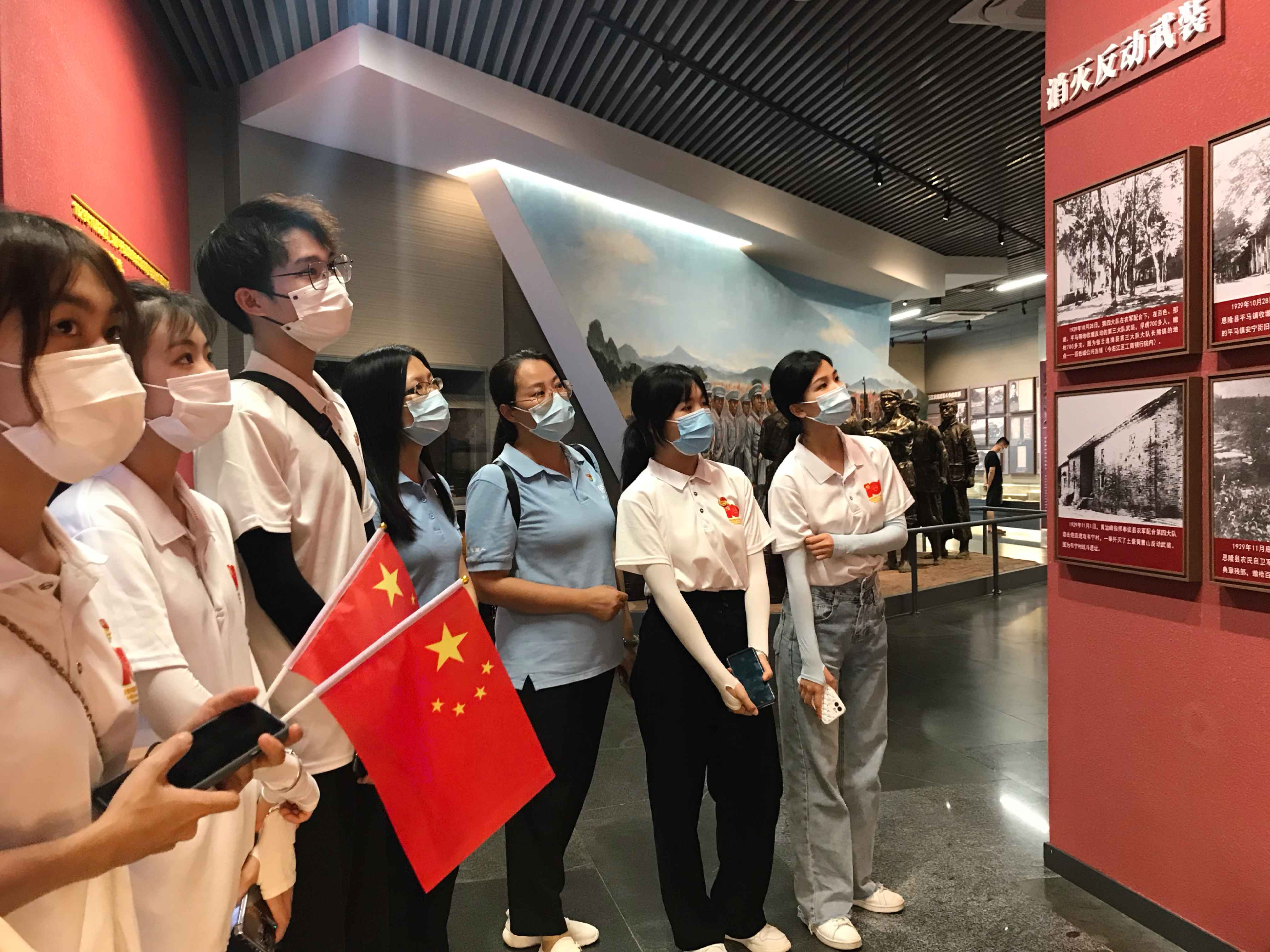14日下午,实践团来到百色市右江区百色起义纪念馆,追寻红色记忆。实践团领学人农滨和黄佳佳两位同学为全体学员讲解了百色起义的时代背景、起义的经过、红七军的成立以及转战南北的历程,重点介绍了在艰苦的斗争环境中产生的可歌可泣的英雄故事,并倡导全体学员坚持学习党史,弘扬革命精神,传承红色基因,赓续红色血脉。在参观期间,实践团学员分工明确,认真收集红色革命素材,为后续的艺术创作做好准备。