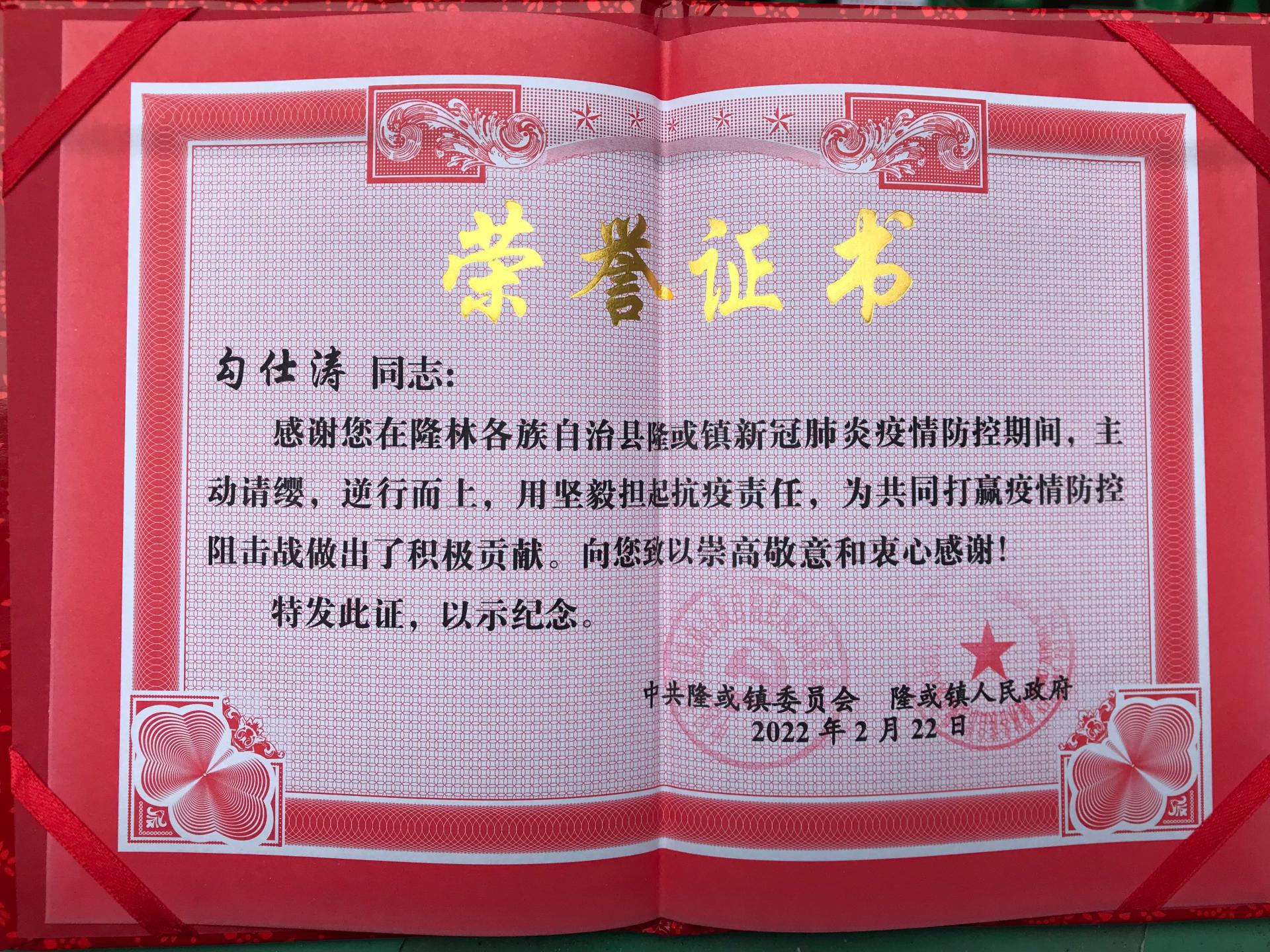 勾仕涛志愿服务荣誉证书