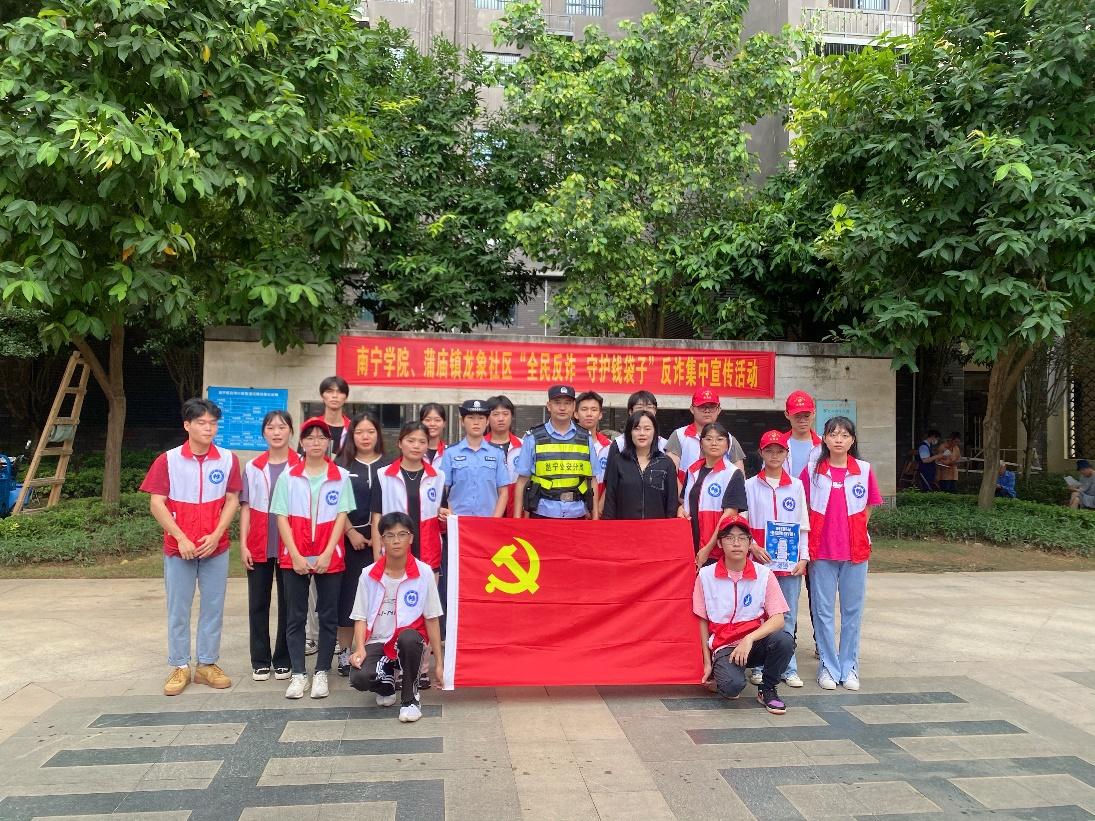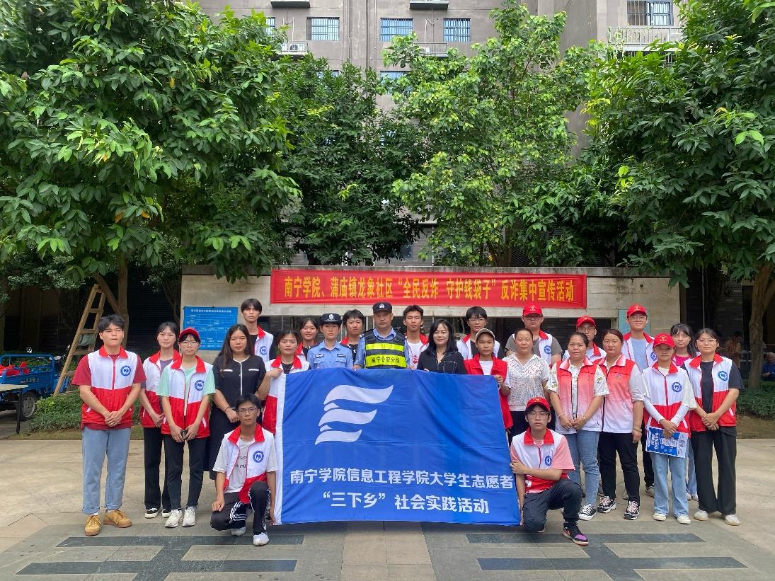 反诈实践团与南宁市公安局邕宁分局警官、龙象社区党群服务中心工作人员合影
