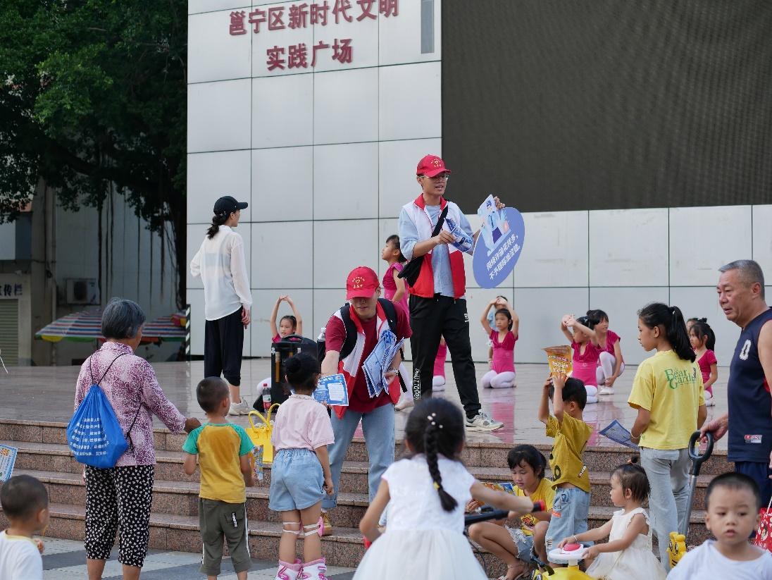 反诈实践团在新兴社区给群众发放反诈知识宣传单,为大众讲解反诈知识