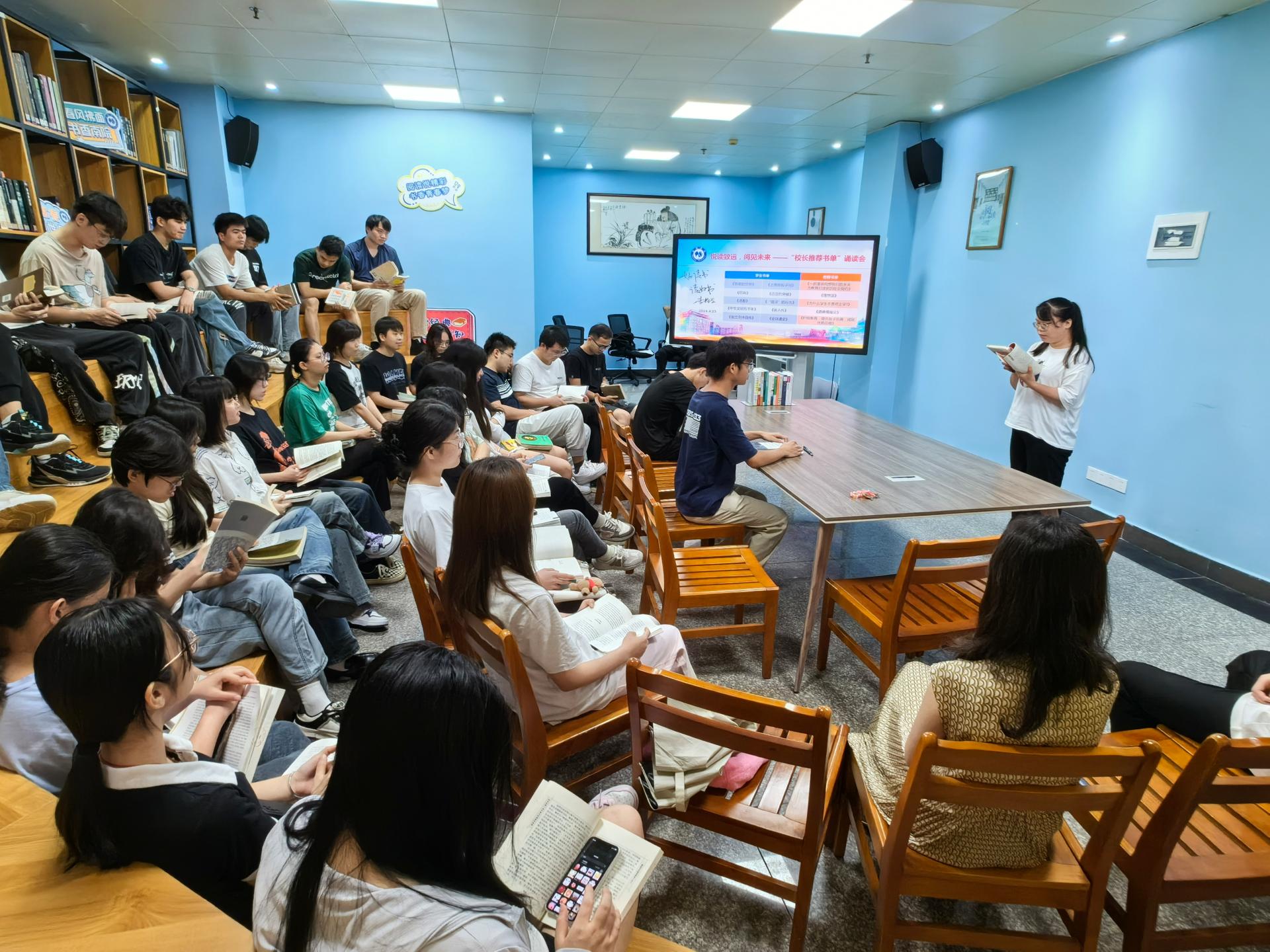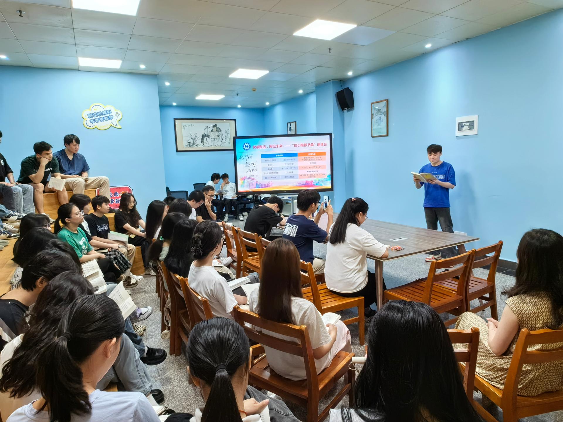 春意盎然,书香沁脾,悦读致远,阅见未来。5月7日下午,由图书馆主办,校读书协会和校主持人队协办的主题为悦读致远,阅见未来——“校长推荐书单”诵读会在图书馆二楼阅读分享空间举办,有50名师生参加此次活动。