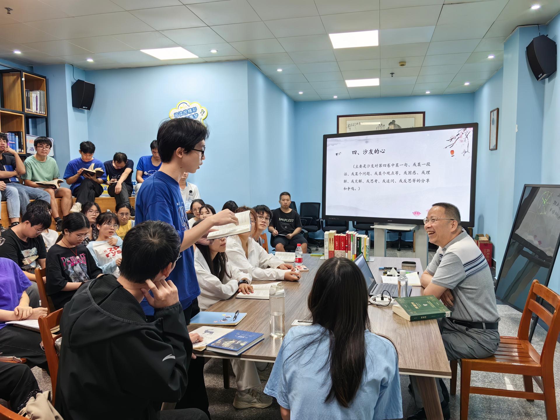 活动中,卢副馆长着重介绍了《理想国》的背景,从柏拉图、苏格拉底、亚里士多德拓展到孔子和墨子等哲学家及代表人物的理念,通过思维维度、辐辏和河流、思想的重合与碰撞等知识简点,将东、西方哲学作对比,以导读的形式与在场师生共读《理想国》。接着,围绕该书第四卷的内容、问题和观点,进行师生分享。现场同学积极思考,并踊跃发表了自己的看法。
