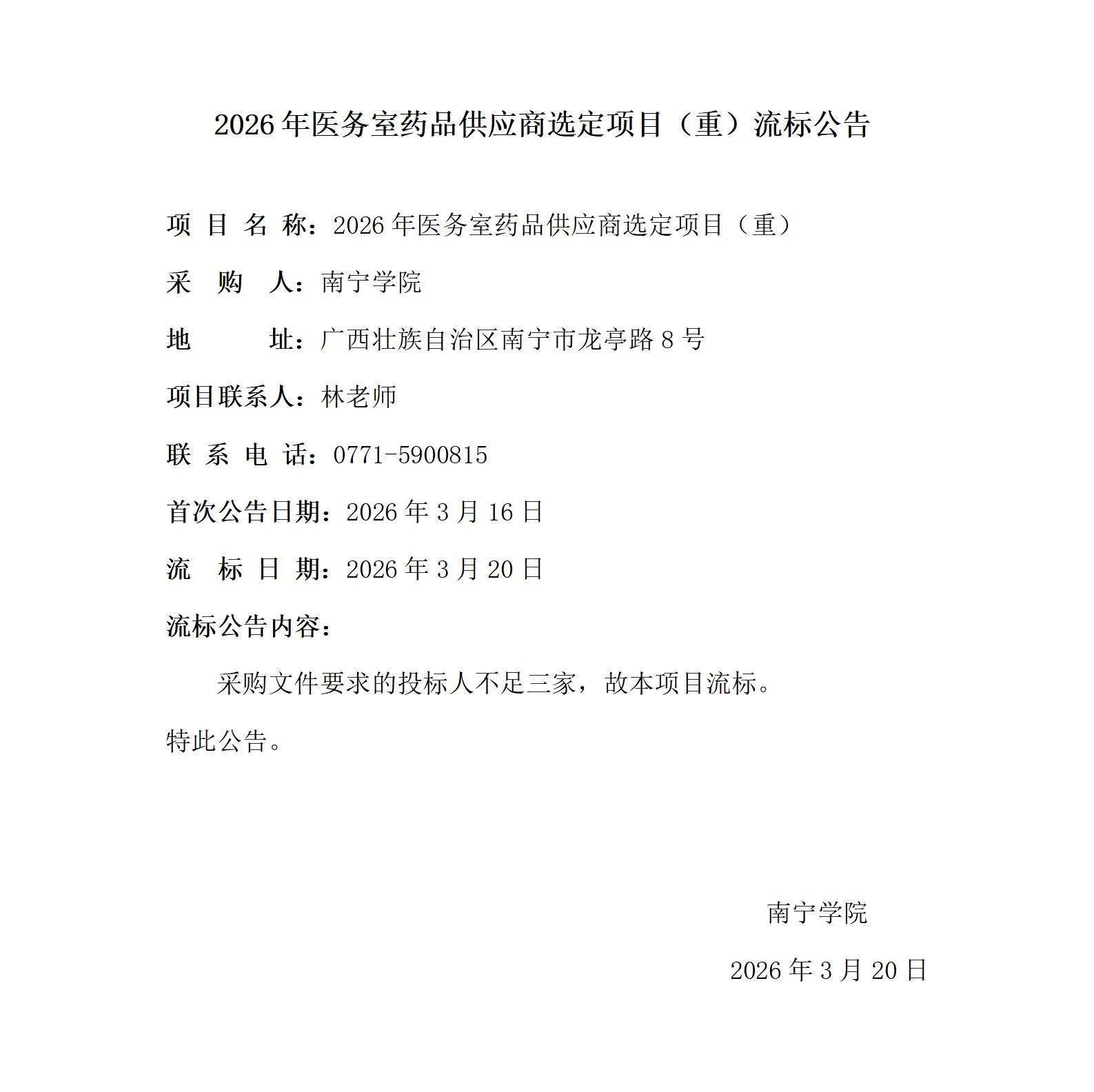2026年医务室药品供应商选定项目(重)流标公告