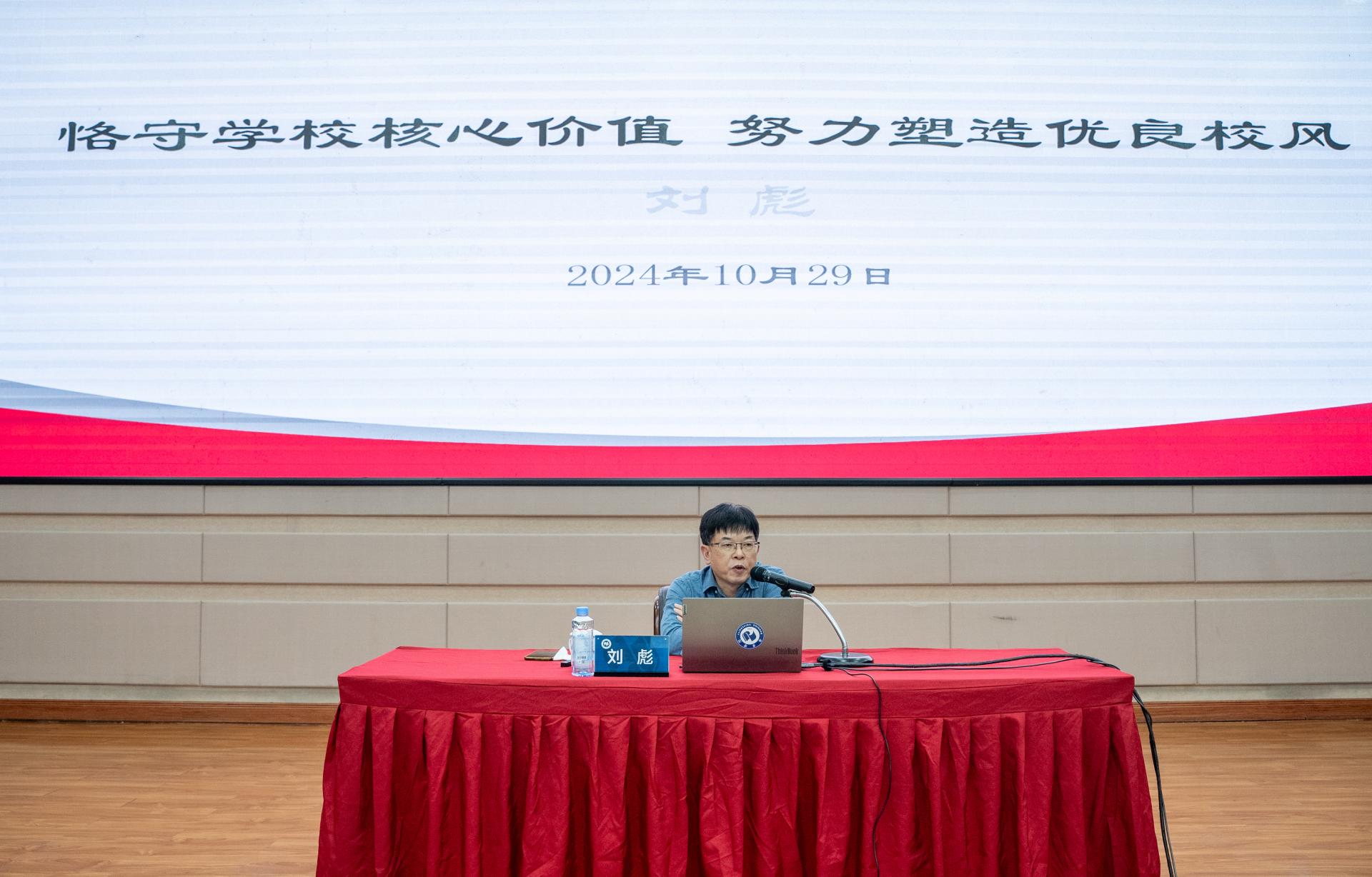 会上,学校党委书记刘彪以《恪守学校核心价值 努力塑造优良校风》为题,就学校核心价值是学校办学的历史总结和价值追求、学校核心价值要进一步植于心从而才能恒于行、以学校核心价值为引领建设有品格有灵魂的校风等三部分内容作报告。