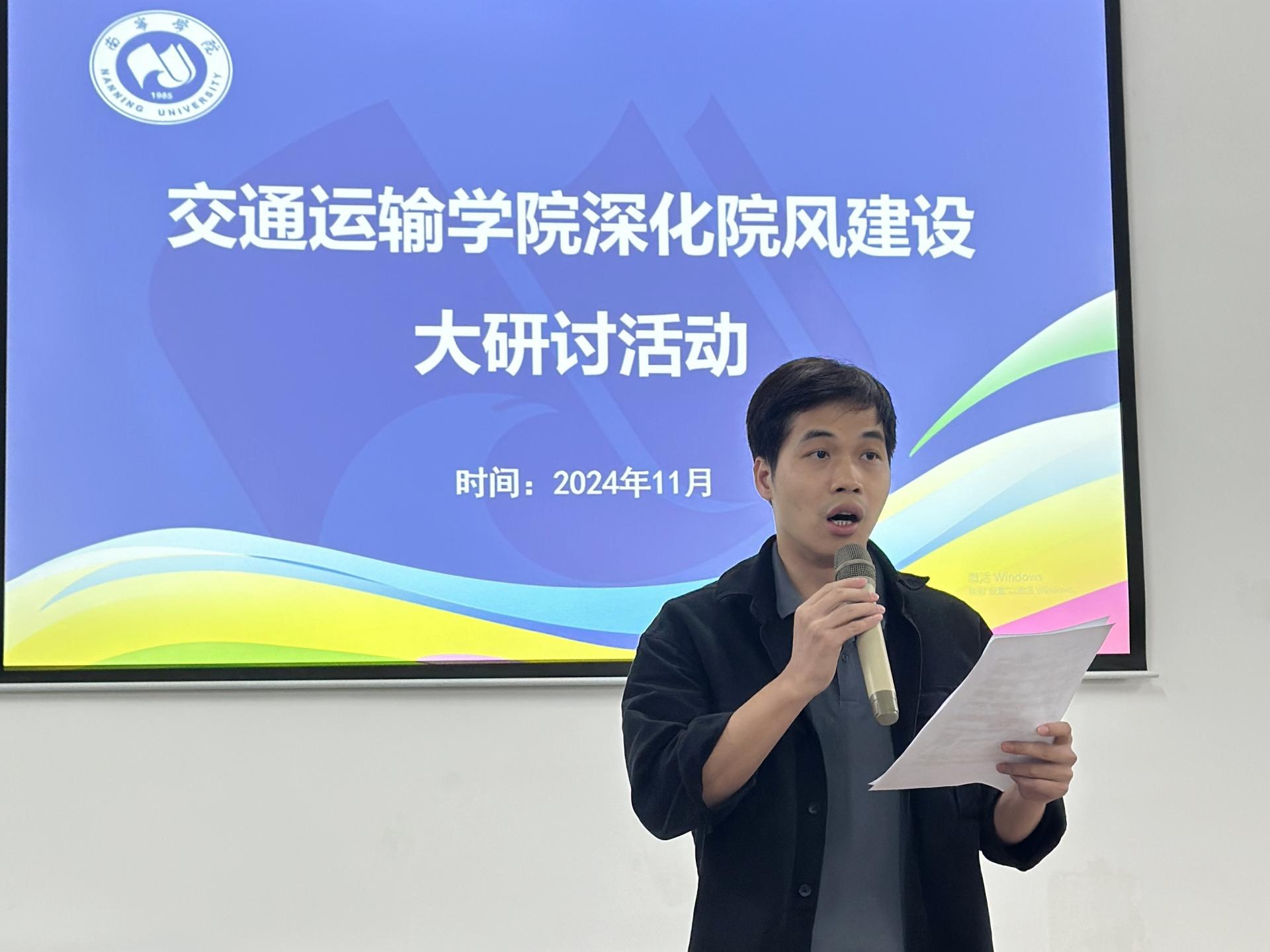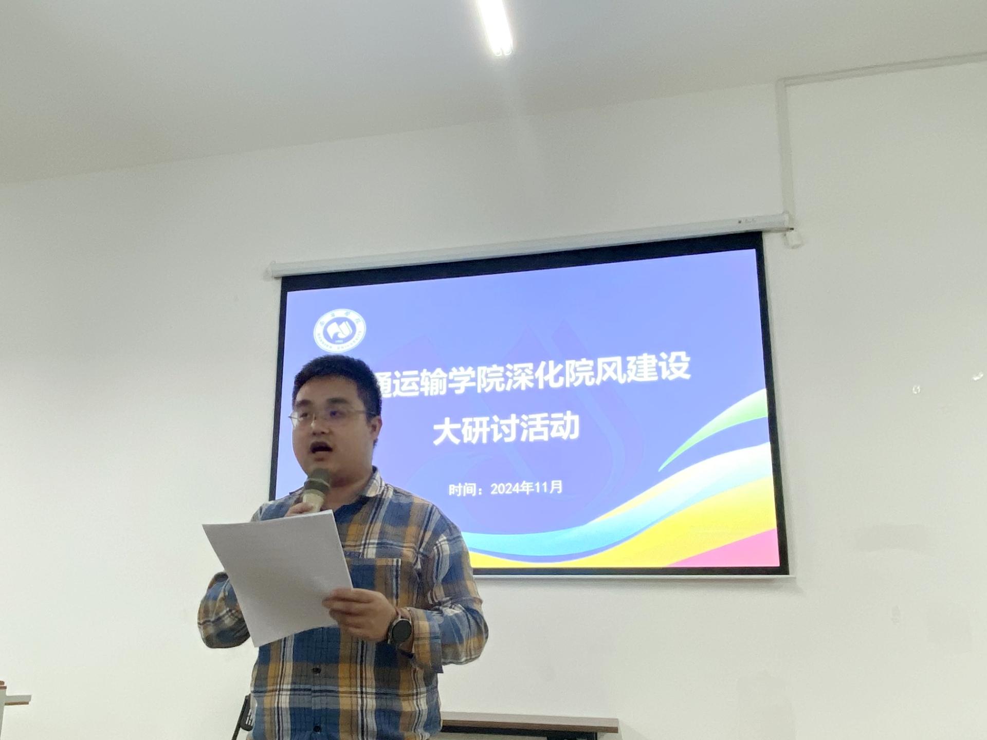 为深化院风建设,促进学院内涵式高质量发展,根据学校的部署,交通运输学院于2024年10月30日全面启动了全院师生共同参与的校风建设大研讨大学习活动。此次活动的核心目标是统一思想、凝聚共识、查找问题、提出举措,提升院风建设,为塑造优良的校风打下坚实的基础。