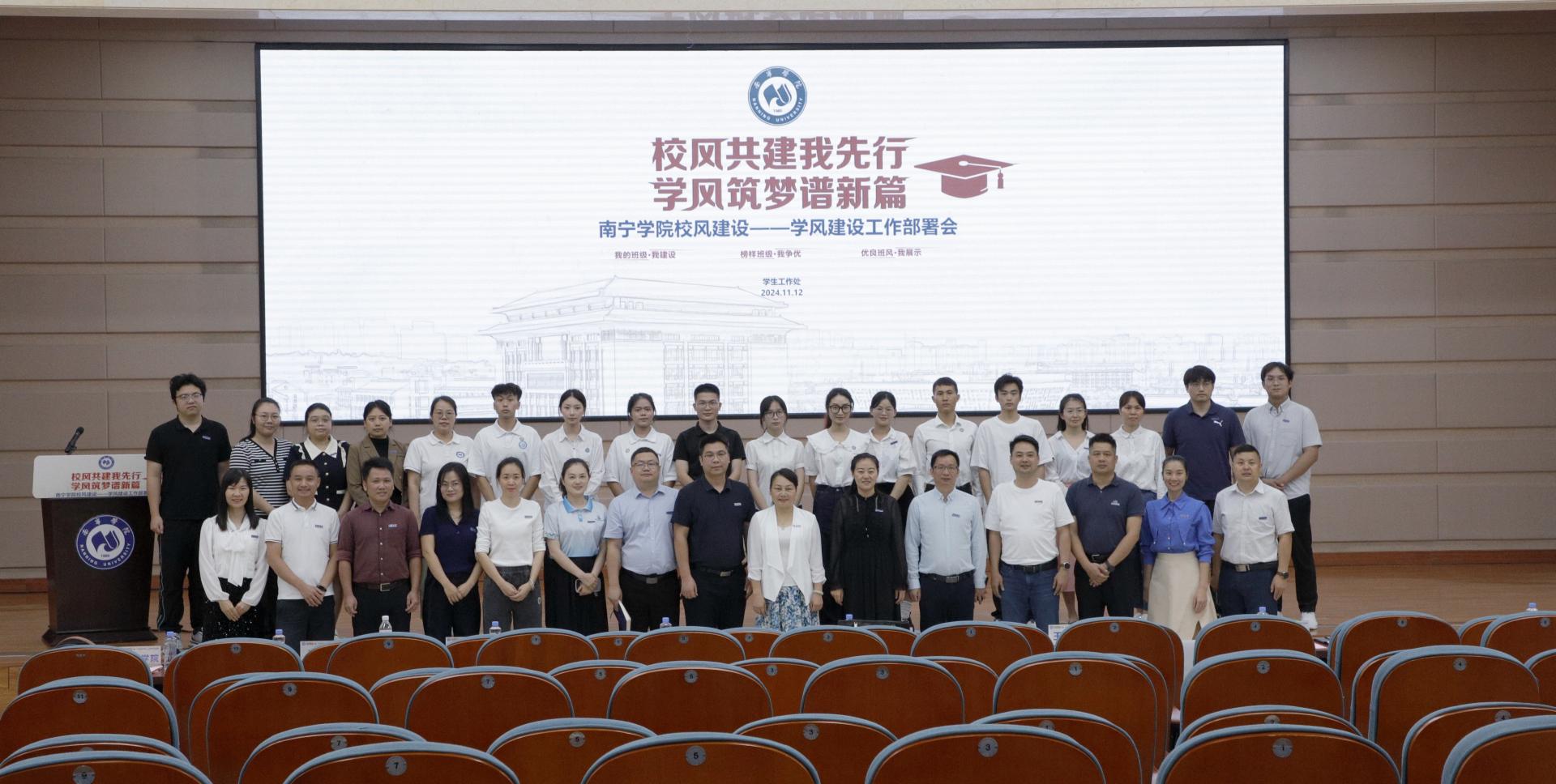 学风建设是校风建设中的重要内容,为积极落实此前学校校风建设动员部署会会议精神,进一步深化我校校风建设,落实立德树人根本任务,培育良好的校园风气,推进学校的学风建设,学校于11月12日在图书馆报告厅召开了“校风共建我先行,学风筑梦谱新篇”为主题的校风建设—学风建设工作动员部署会。学校党委副书记、副校长韦粤桂,学工处、校团委全体成员,各二级学院分管学生工作的学院领导,全体专兼职辅导员、班主任和各基层班级学生代表参加了此次会议,会议由校团委书记李志主持。