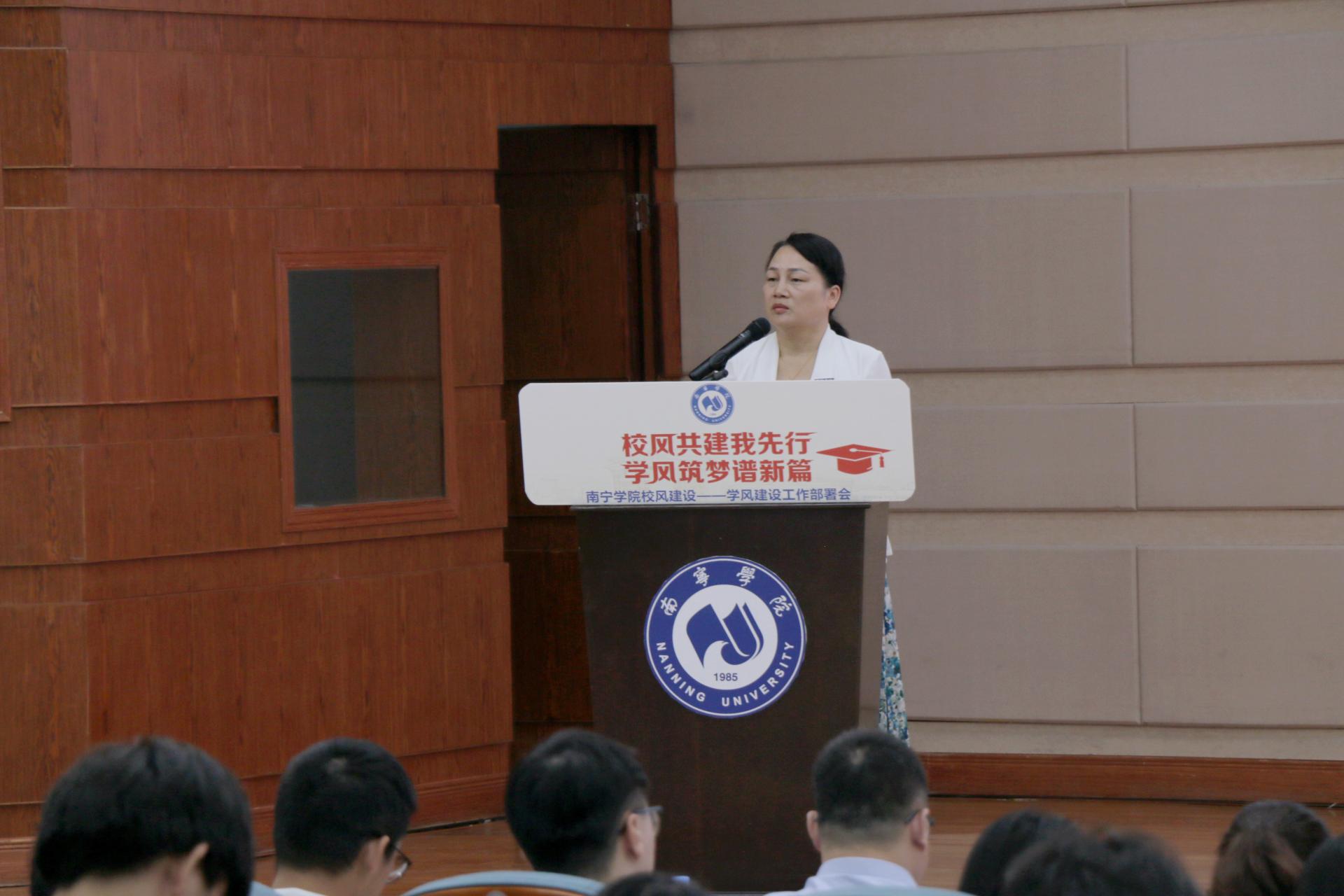 最后,学校党委副书记、副校长韦粤桂在会上作动员讲话,韦副书记强调,一直以来学校高度重视校风建设,特别是学风建设工作,优良的学风是学校高质量办学的重要体现,学风建设能够促进学校教学质量的提升,教学相长,能推动高校教育事业持续健康发展。韦副书记在会上还举例了一些校内事件案例,指出当前学风建设工作当中仍存在的问题,希望全体师生能够学会“把脉”,找出学风建设中的“病症”并加以改之,提高认识、真抓实干,为学校形成良好的校风共同努力。