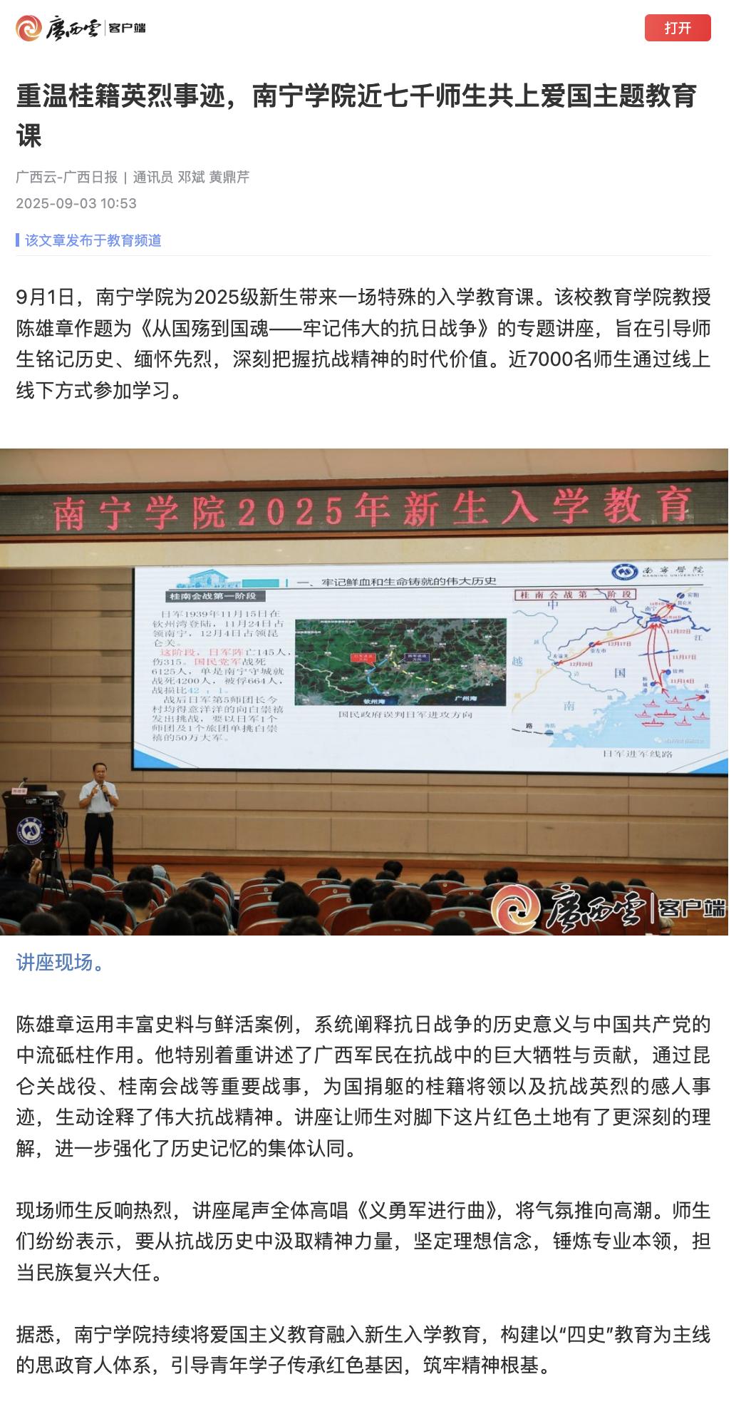 【媒体看南院】广西日报报道我校近七千师生共上爱国主题教育课,重温桂籍英烈事迹