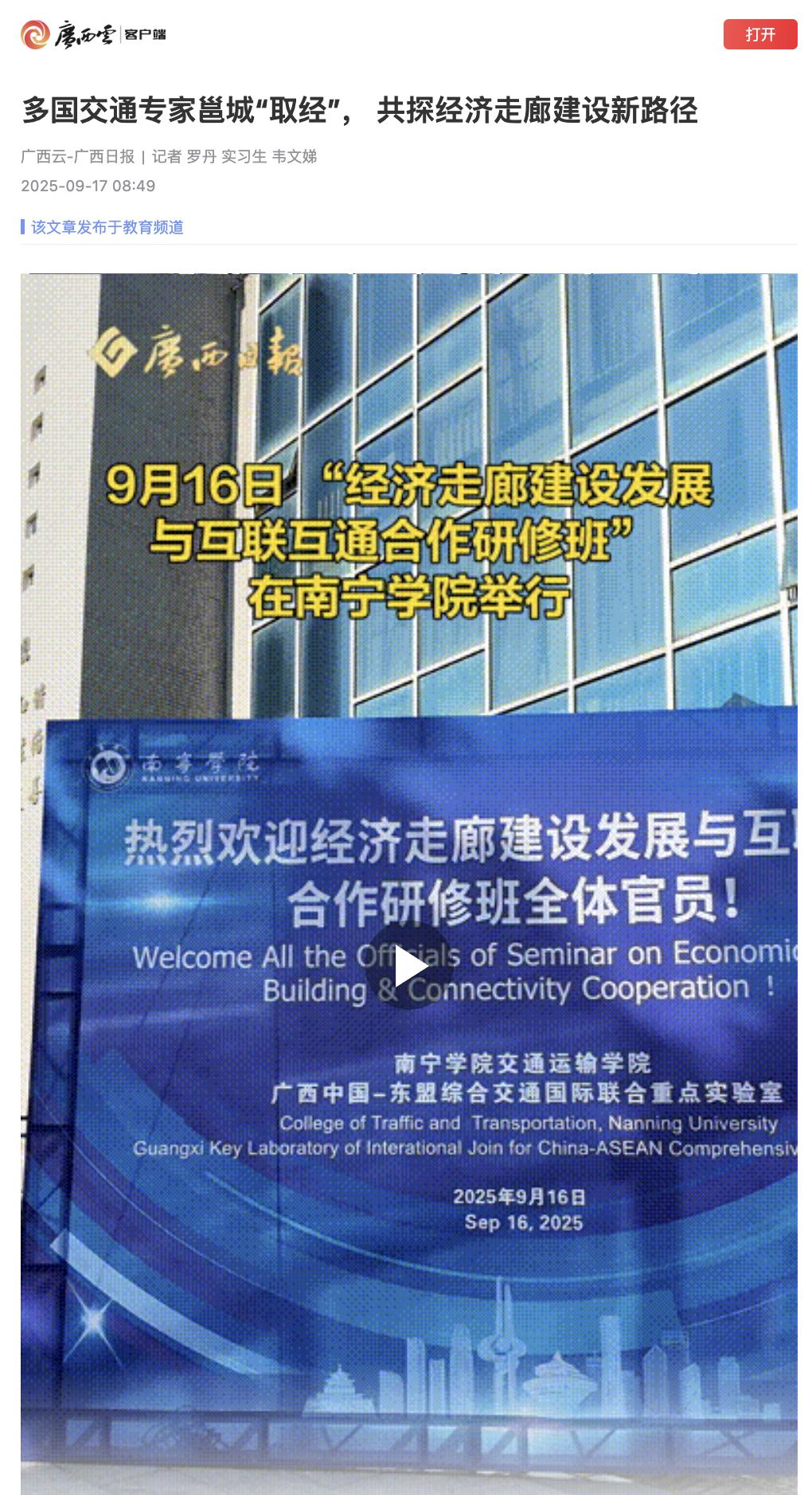 1. 广西日报:多国交通专家邕城“取经”, 共探经济走廊建设新路径 https://apph5.cloudgx.cn/article/sync1968115028191952896