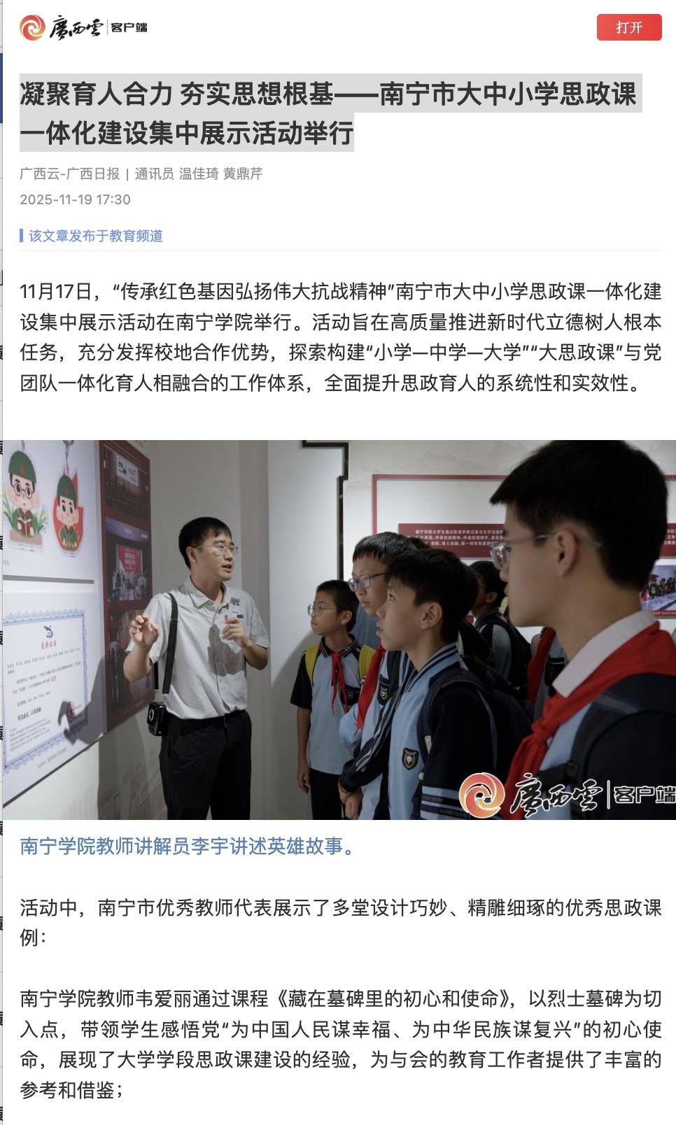 1.广西日报:凝聚育人合力 夯实思想根基——南宁市大中小学思政课一体化建设集中展示活动在Beat365中文官方网站举行 https://apph5.cloudgx.cn/article/sync1991076667563376640