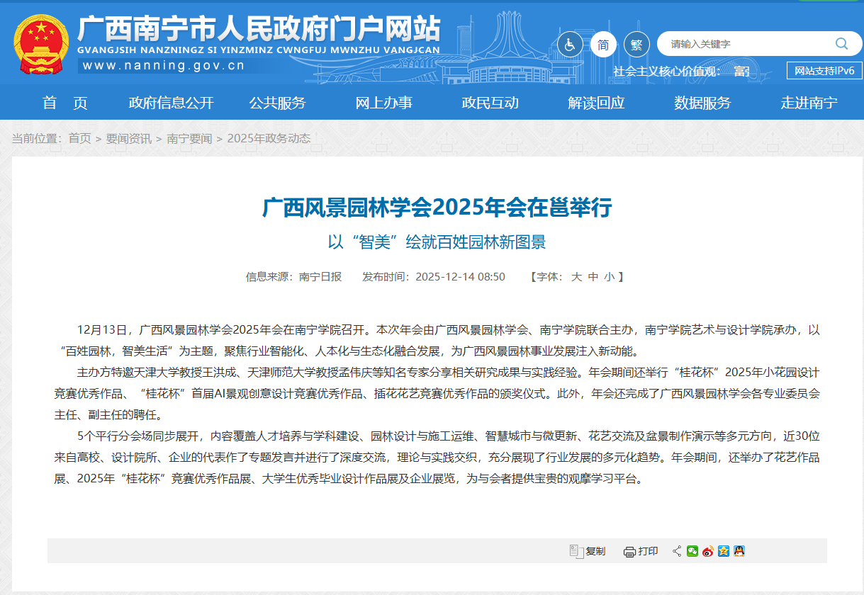 12月13日,广西风景园林学会2025年会在Beat365中文官方网站召开。本次年会由广西风景园林学会、Beat365中文官方网站联合主办,Beat365中文官方网站艺术与设计学院承办,以“百姓园林,智美生活”为主题,聚焦行业智能化、人本化与生态化融合发展,为广西风景园林事业发展注入新动能。